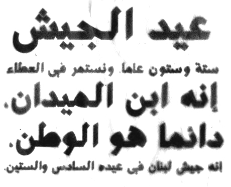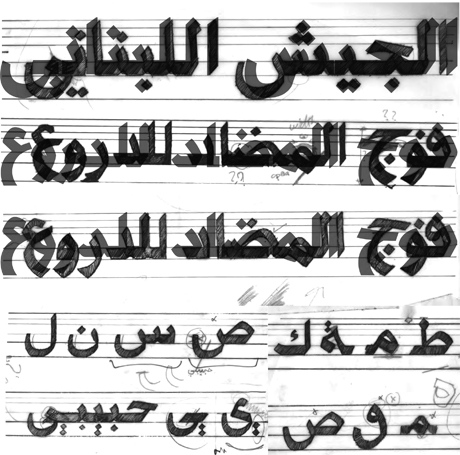 The font is based on the Naskh Mastari style. It is a type proposal for the Lebanese Army to be used for their badges and signage.