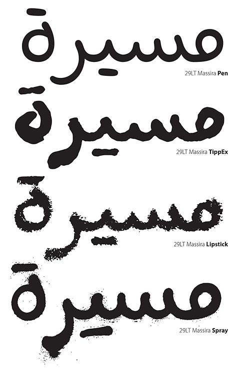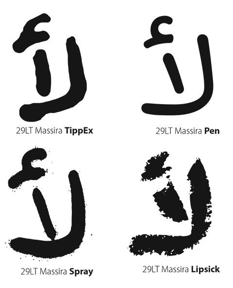 29LT Massira is a simplified spontaneous handwriting set of fonts based on the casual writings of the Lebanese people and the Ruqaa Arabic calligraphic style. The type-family does not have weights but different styles based on different writing tools. The four styles are: PEN, TIPPEX, LIPSTICK and SPRAY.