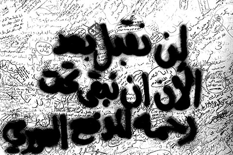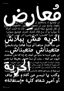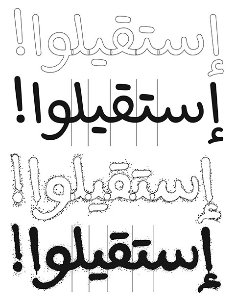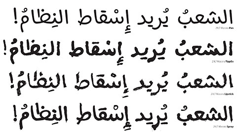 In 2006 I only created the Pen and Spray styles since these were the most used tools for the graffiti writings. Completing the type-family was always among my work tasks but got postponed due to commitments to other corporate projects. The project was on hold until 2011, The Arab spring that started in Tunisia and spread all over the Arab world encouraged me to look again at the Massira type project and finalize it. Graffiti is always part of revolutions and demonstrators will use any writing tool to shout out their thoughts and demands.