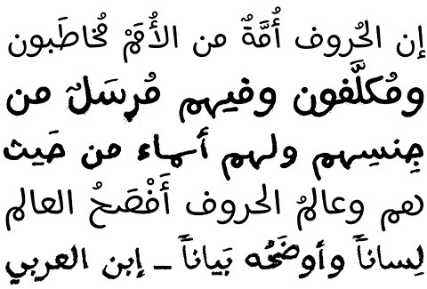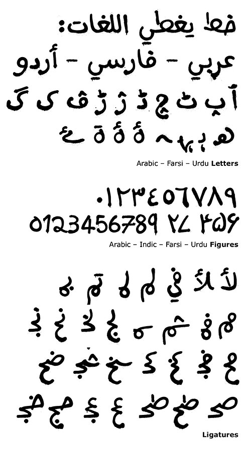 The Massira fonts cover the Arabic, Persian and Urdu languages. Around 115 ligatures are added to the main character set in order to allow certain fluidity in the fonts and to mimic the spontaneity of the Arabic handwriting as much as possible.