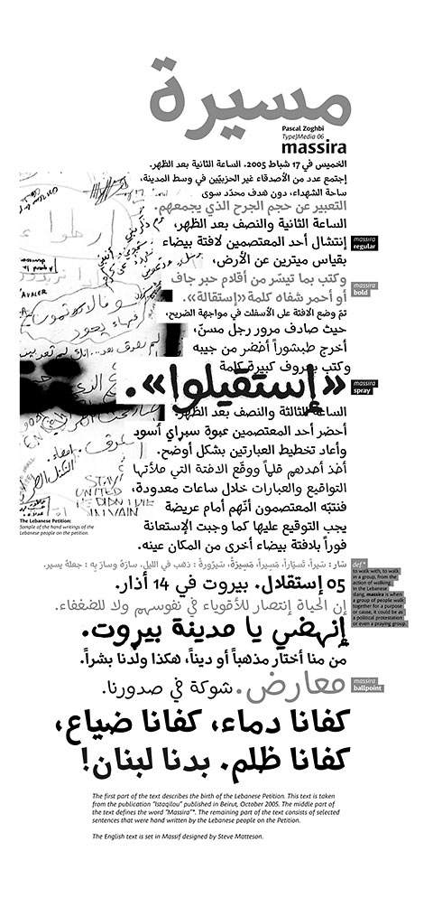 The Massira type project started as my graduation project at the MA program in “Type & Media” at “The Royal Academy of Arts” in The Netherlands. The type-family was inspired from the graffiti writings of the demonstrators in Martyrs Square in Beirut after the assassination of the PM and the withdrawal of the Syrian army from Lebanon throughout 2005 – 2006. Analyzing the handwritings on the petition and noting the different kinds of writing tools used (pen, chalk, lipstick, spray, etc.…) used led to the creation of Massira type project.
