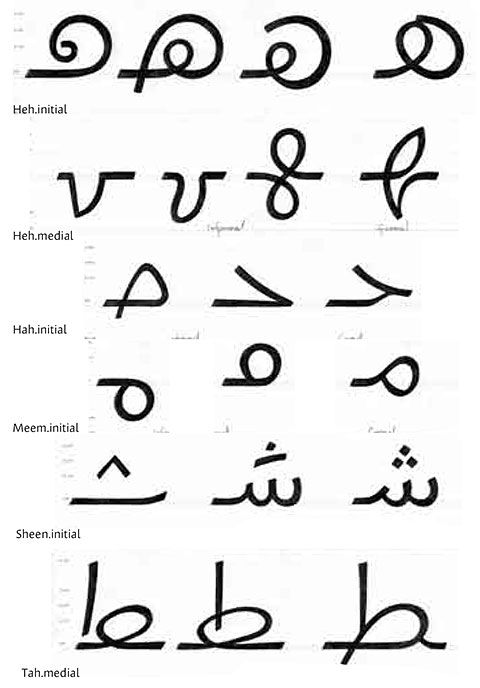 After the analysis was done, the variations of each letter in the Arabic language were drawn and ranked according to the letter’s presence in various handwritings. The letterforms with the highest ranks got chosen and drawn in the Massira fonts.