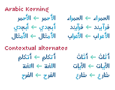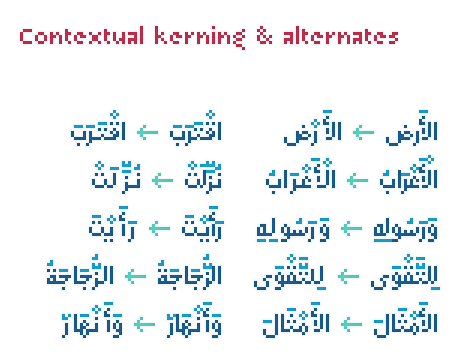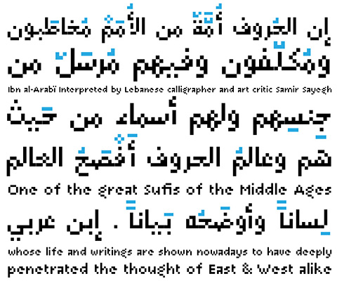 Arapix was originally designed for a web project that didn’t see the light a few years back. It started with the idea of fitting both Latin and Arabic into a 12 pixel vertical grid. The latin glyphs fitted properly within the vertical limits, but when it came to the arabic glyphs, it proved to be more challenging. Arabic letters with lower diacritic dots like the (Yeh-fina) or letters with accents above like the (Alef-Hamza-above) need much more space than any Latin letter, add to this the fact that accents needs to be positioned above and below the glyphs. It is technically impossible to fit a (Yeh-fina-kasratan) or a (Alef-Hamza-above-shadda-damma) into 12 pixels. Initially the accents were dropped and not included in the design, but although it seemed impossible at the start, Sylvain Mazas found a solution in the end, including as many contextual alternates and contextual kerning as needed to avoid every collision between letters and diacritics, letters and accents, and diacritics and accents. The contextual kerning was added to achieve an even letter and word spacing in longer text.