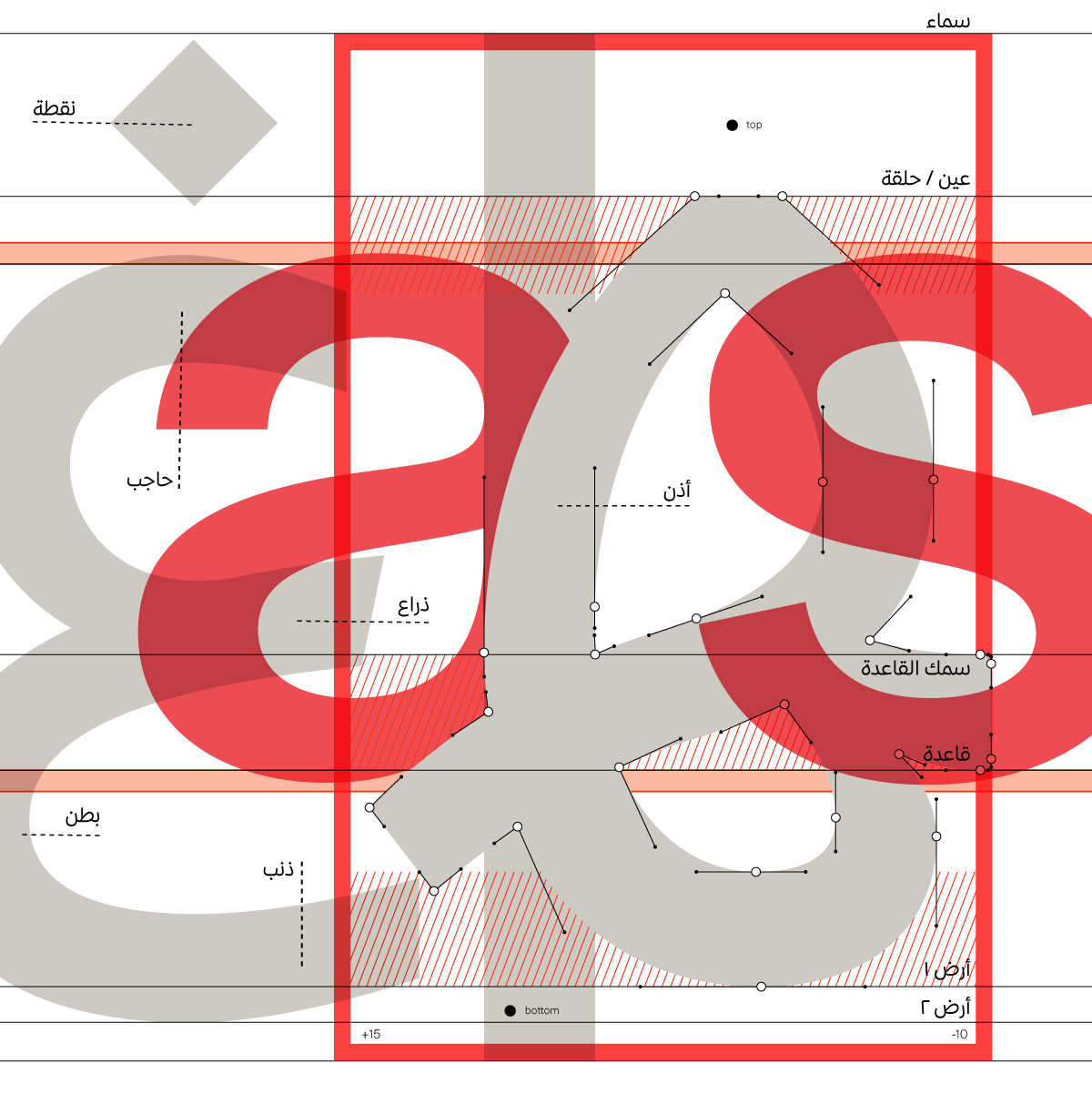 يجلس الخط الطباعي اللاتيني عادة على خط ارتكاز، بخمسة مستويات عمودية مرجعية: خط الارتكاز (Baseline)، ارتفاع الحرف إكس (x-height)، الصاعد (Ascender)، النازل (Descender)، خط ارتفاع الحرف الكبير (Caps-height). بالمقابل، فإن الحرف الطباعي العربي أكثر تحرراً، مع مستويات غير مرئية أكثر في خدمة المصمم. يمكن لخط إنساني كهذا الخط مستوحى من مخطوطات بخط النسخ، أن يستخدم حوالي إثني عشر مستوىً وهمياً، في حين يستخدم خط آخر مرتكز على الخط الكوفي فقط أربعة إلى خمسة مستويات. هذا يعني أنه على المصمم أن يمتلك المعرفة المحترفة لأساليب وأنظمة التخطيط العربي ليكون مبدعاً ويترجم قواعد التخطيط لخطوات توجيهية في الخط الطباعي لاستخدامها في انشاء الخط.