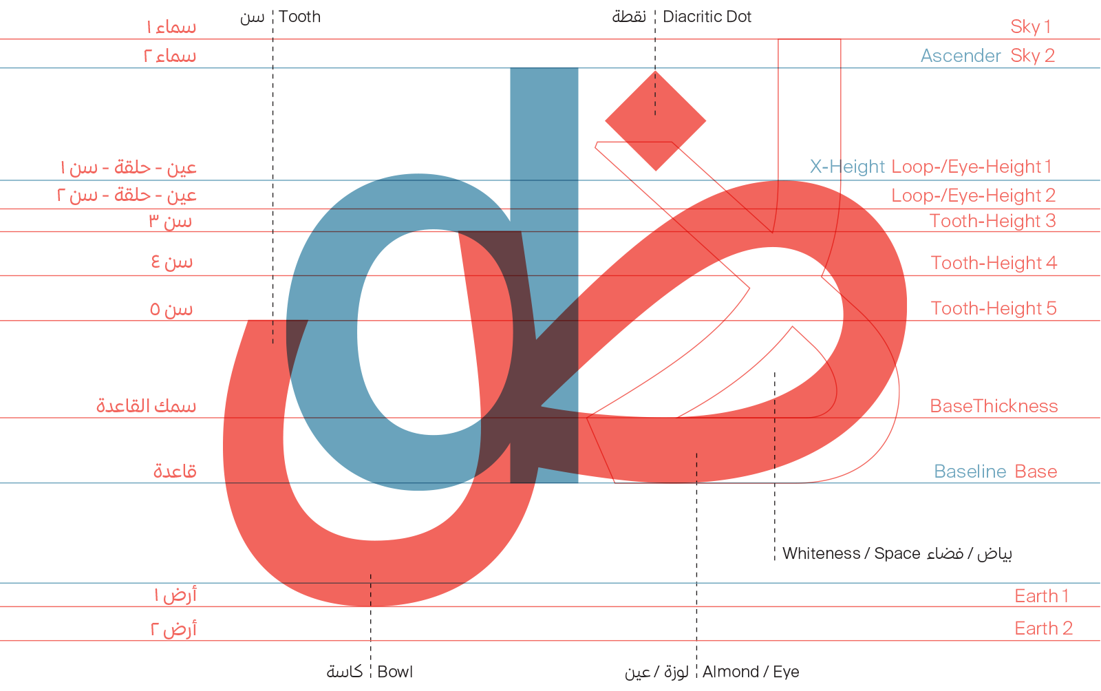 A summarised and edited version of this article was firstly published in Eye Magazine issue #90 within the “Beyond Latin: Type design panel” article published in June 2015. This brief article on Arabic type anatomy is the fruit of my experience from the past years in: 1. Designing Arabic fonts; 2. Lecturing about Arabic typography; 3. Discussing the Arabic script with calligraphers and colleagues; and 4. Reading and researching about Arabic calligraphy. Hopefully I will be able to publish a comprehensive detailed article or book on this topic and other Arabic typography topics in the near future.