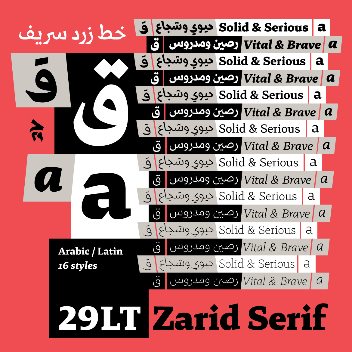 29LT Zarid Serif type family consists of 16 styles, 8 Standard styles, and 8 Slanted styles, covering the following weights: Thin, Extra Light, Light, Regular, Medium, Semi Bold, Bold, and Black. The Arabic and the Latin mirror each other’s appearances much like fraternal twins with compatible attitudes.