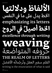 The design approach, with open counters, clean terminals/finials, balanced weight and high contrast, are all elements that bring the Arabic and Latin scripts together. No surprise, both scripts were created in synergy and were inspired from each other simultaneously. The neo-calligraphic Naskh style in the Arabic script is complemented by a calligraphic Serif Latin, inspired by the broad nip pen writing technique.