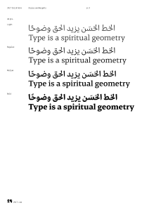 29LT Zarid Text type family consists of 8 styles: 4 Standard styles and 4 Slanted styles, covering the following weights: Light, Regular, Medium, and Bold. The range of weights provides suitable typographic hierarchical solutions in bi-script Arabic and Latin layouts.