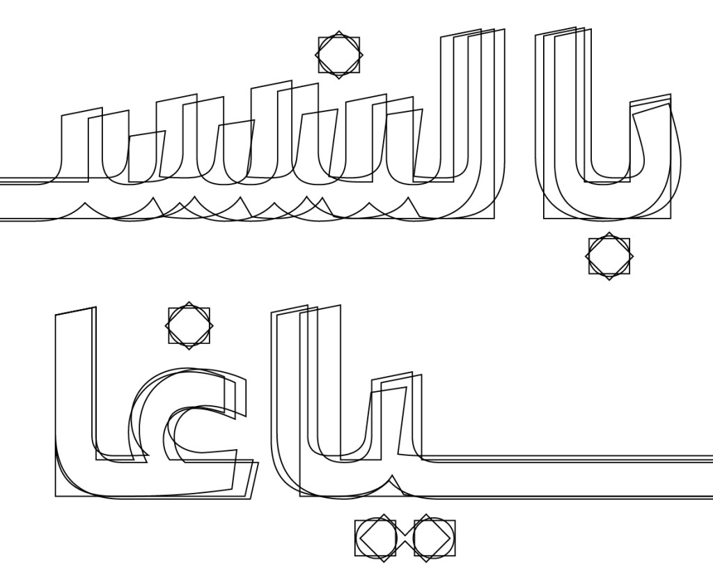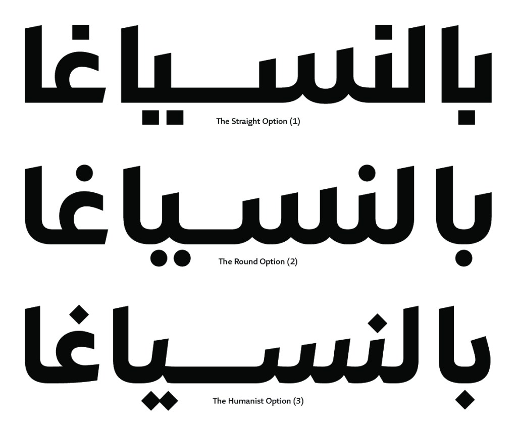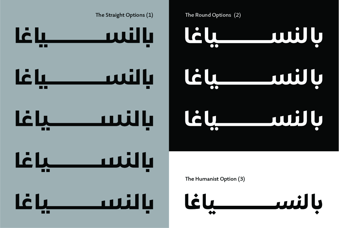 After establishing the typographic vertical heights, he defined the weight and contrast of the letters and developed three main routes for the overall letter structures: 1) straight, 2) rounded, and 3) humanist options. The first two options come from the simplified modern Kufic style, while the third comes from the simplified Neo-Naskh style.