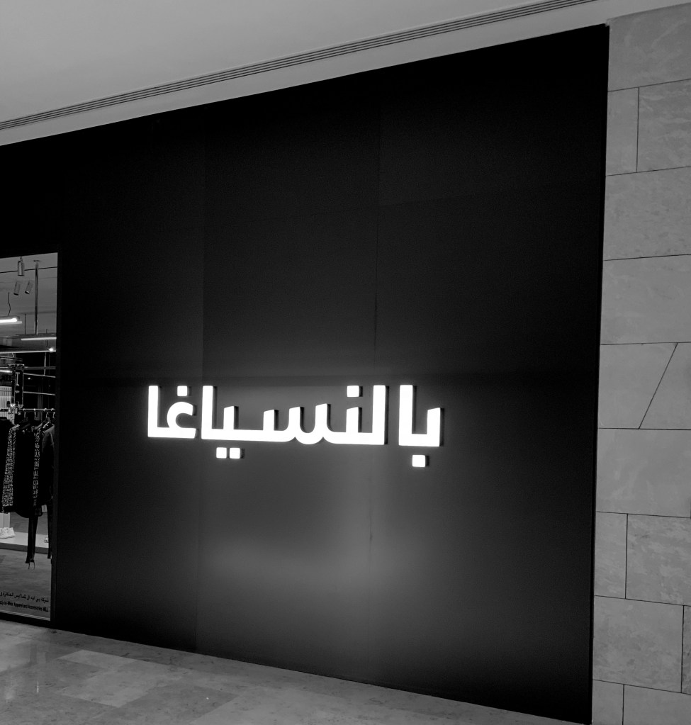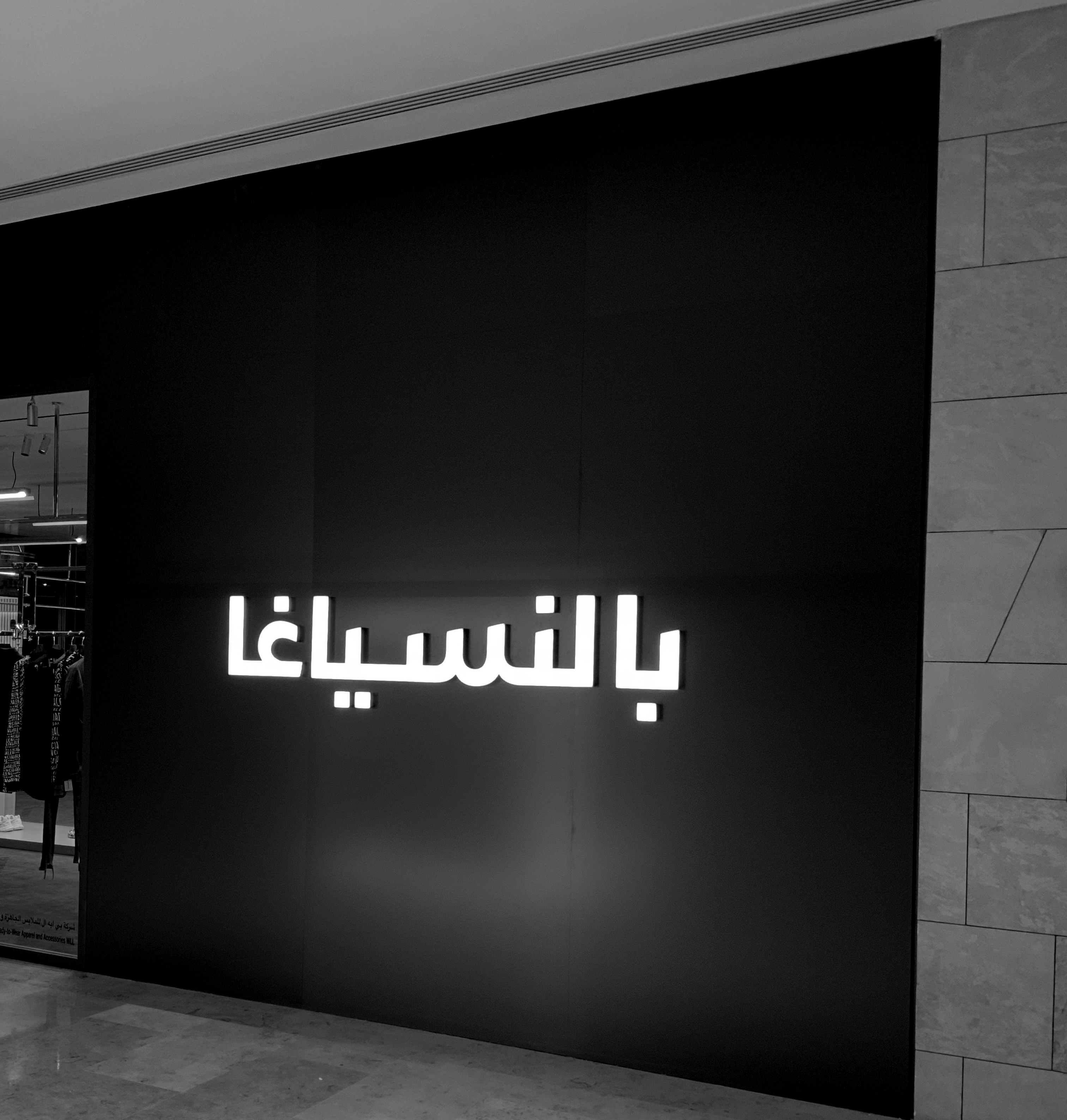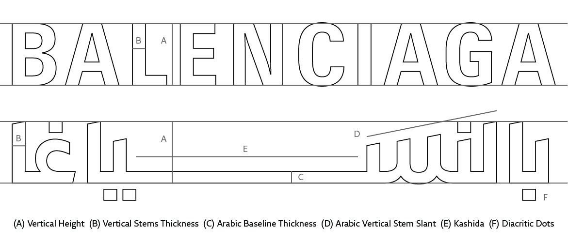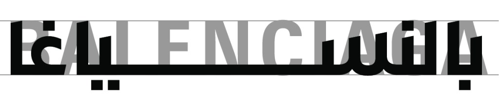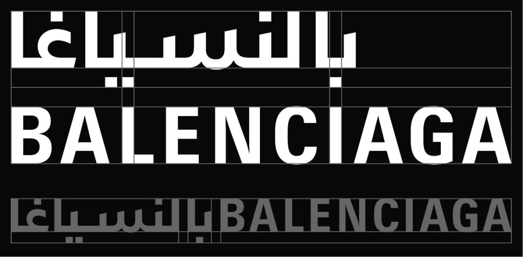 Luckily, the Arabic word بالنسياغا Balenciaga has no descending Arabic letters, and all of the letterforms, except for the letter Ghain, are composed of straight or diagonal vertical pen strokes. This facilitated the task of achieving the vertical pen stroke emphasis in the Arabic logo to echo the vertical stems in the Latin.