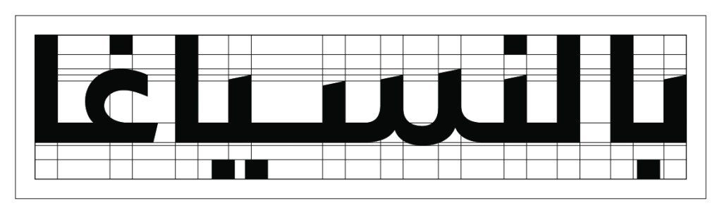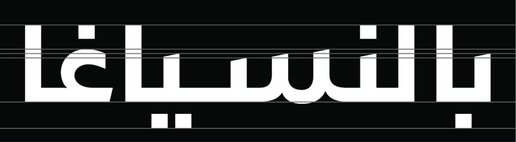 Zoghbi aligned the Arabic baseline to the Latin baseline and the Arabic ascender-height to the Latin caps-height. The question was how to draw the medial letters, and how high they should be to balance with the Arabic ascending letters and the Latin capitals. He tested two main median-lines, a higher one for the Kufic based letterforms and a lower one for the Neo-Naskh typographic option.