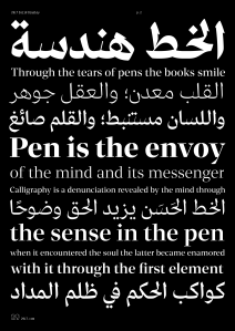 Zarid Display is bold by nature and extreme in character. Its’ evident strong contrast between the thick and thin pen strokes is abrupt and dramatic. However, the application of this contrast had to be applied differently on the distinctive Arabic and Latin scripts since they stem from different calligraphic routes. The concept of transition from a broad-nibbed pen to a pointed-pen in order to achieve the desired contrast doesn’t apply to the Arabic letterforms as it does to the Latin complements. In Arabic, the writing notion is “translation with rotation” using only the “qalam” that is similar to the broad-nibbed pen. On the contrary, the writing theory in the Latin is based either on the broad-nibbed pen (translation principle) or the pointed-pen (expansion principle).