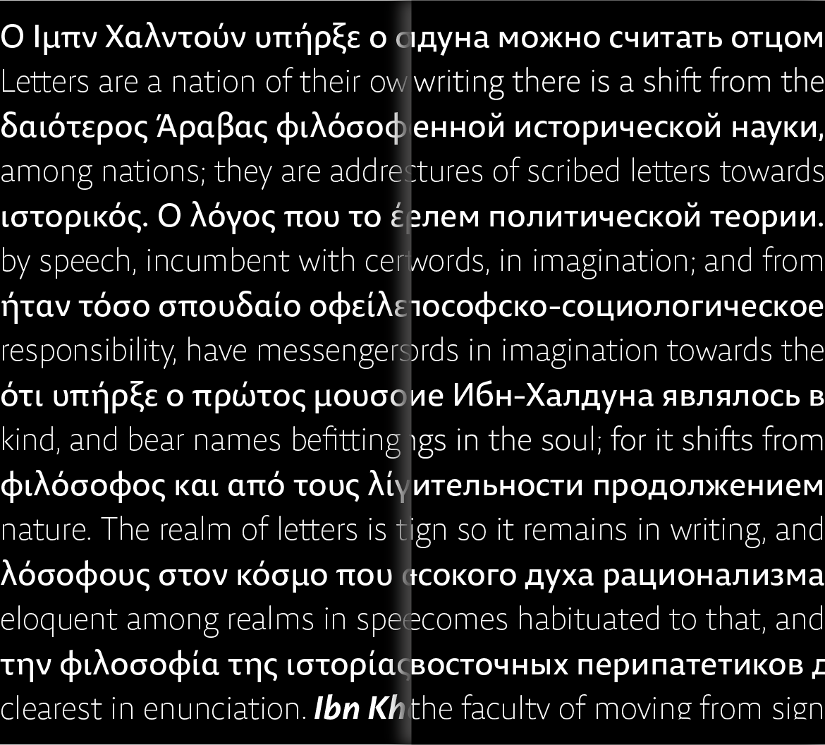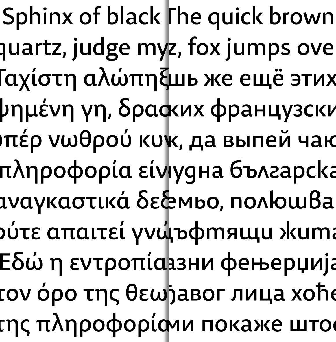 The expansion of 29LT Zarid Sans to Cyrillic and Greek was an interesting task. When it comes to Cyrillic, people often consider the script to be very square and rigid. Greek on the other hand, with its many round shapes, is often the opposite — very soft and fluid. Consequently, the challenge of a multi-script 29LT Zarid Sans was to remain respectful to the character of both scripts, and at the same time introduce design details that brought all the scripts together in harmony.