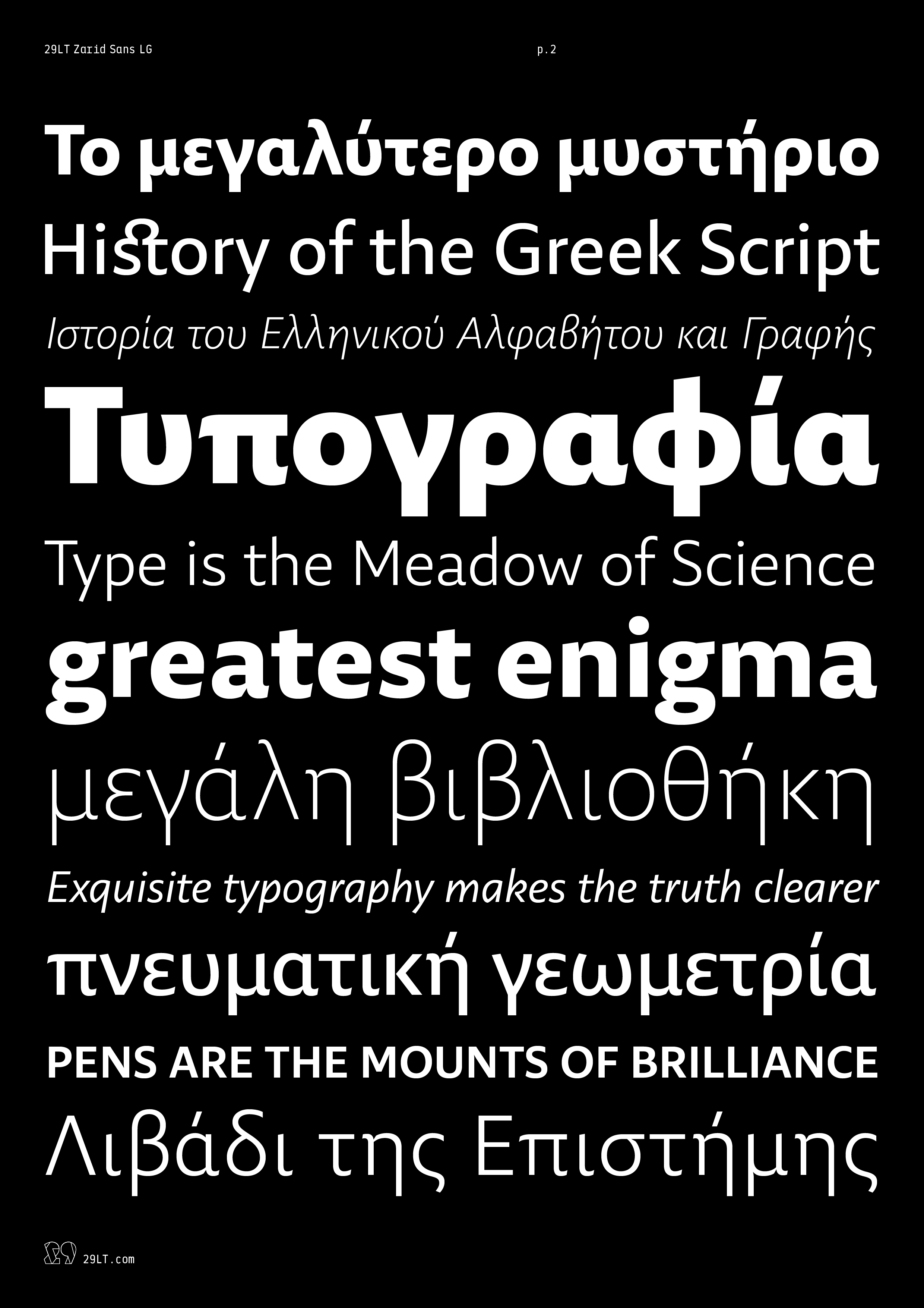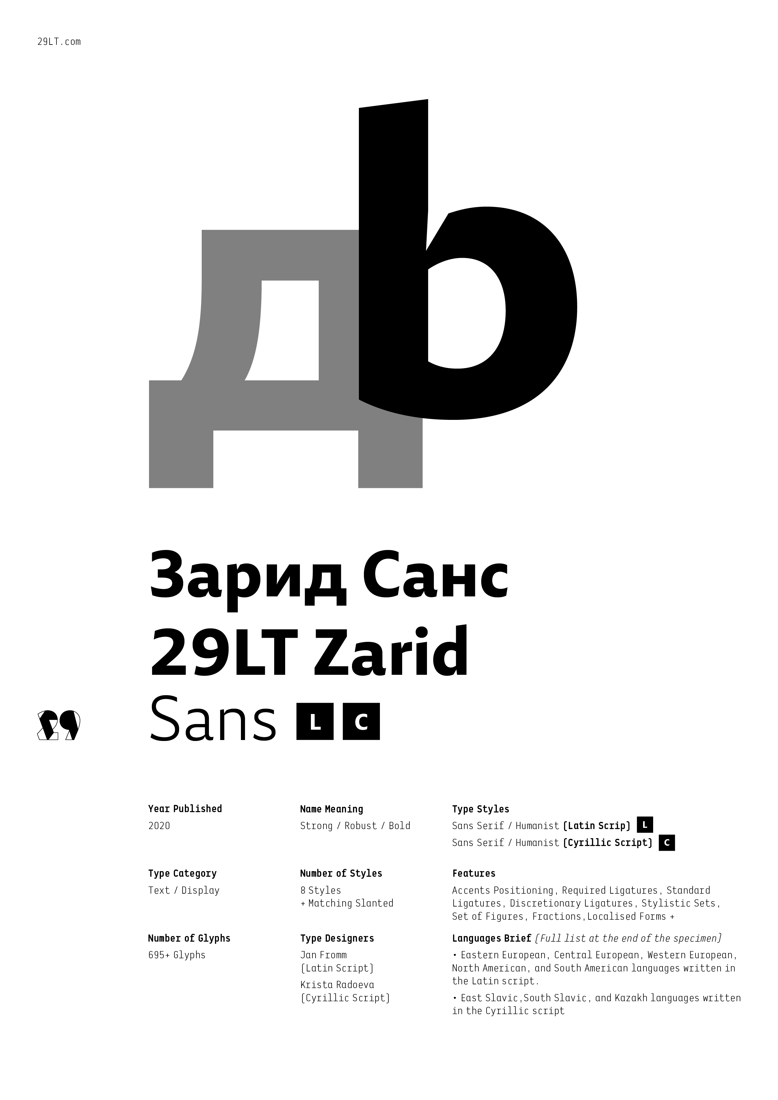 Visit 29LT Zarid Sans LG webpage on www.29LT.com website and download the type specimen for full information about the typeface.