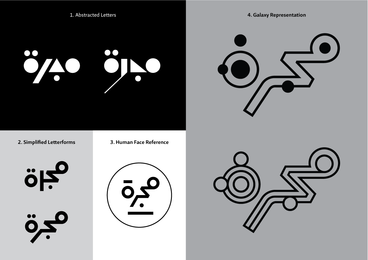 The Simplified Letterforms approach examines the flexibility of the word مجرّة (majarra) and plays around with the endless letter positioning possibilities and connections. Could the Meem link to the Jeem for the top, middle, or bottom of the baseline? Would the Meem be a full circle or a semicircle? How could the Jeem link to the Ra’ – from the top or the middle? Would the Ra’ be straight, slanted, or rounded? Where would the Ta’ Marbouta sit – on the baseline, or aligned from the top, middle, or bottom of the composition? Would the diacritic dots be circular, square, or rectangular? With these ideas translated into typographic options, the final logo was fine-tuned.