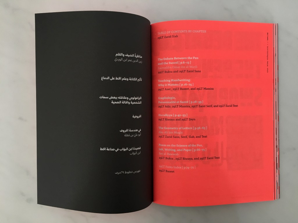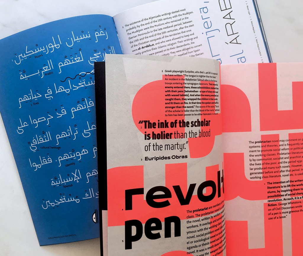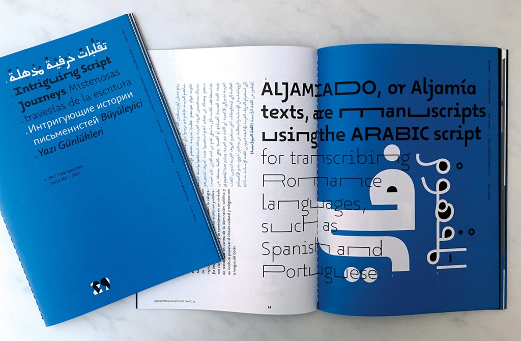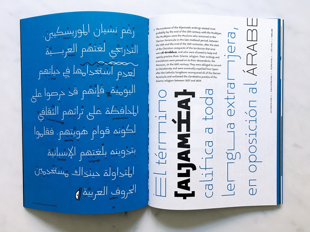 The 2021 publication revolves around the topic of the diverse cultural, political, and linguistic journeys a certain language undertakes, and the different scripts that are adopted to personify it. This topic came to light from the Aljamiado research throughout 2020 and 2021 while the typefaces 29LT Okaso and Oskura were being created. Aljamiado manuscripts were written using the Arabic script, but when read out loud, they sound like archaic Spanish filled with Arabic Islamic words (lexicons). By definition, Aljamiado, or Aljamía texts, are manuscripts using the Arabic script for transcribing Romance languages such as Spanish and Portuguese. You can read the full article about the 29LT Okaso typeface, where a comprehensive explanation of this topic is tackled.