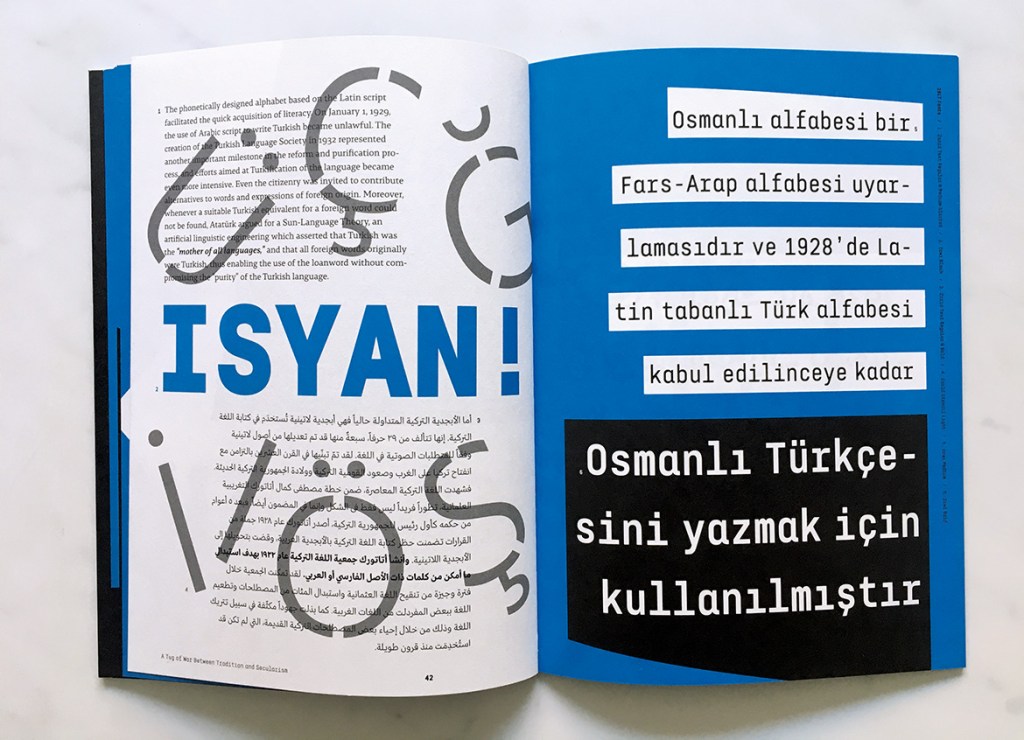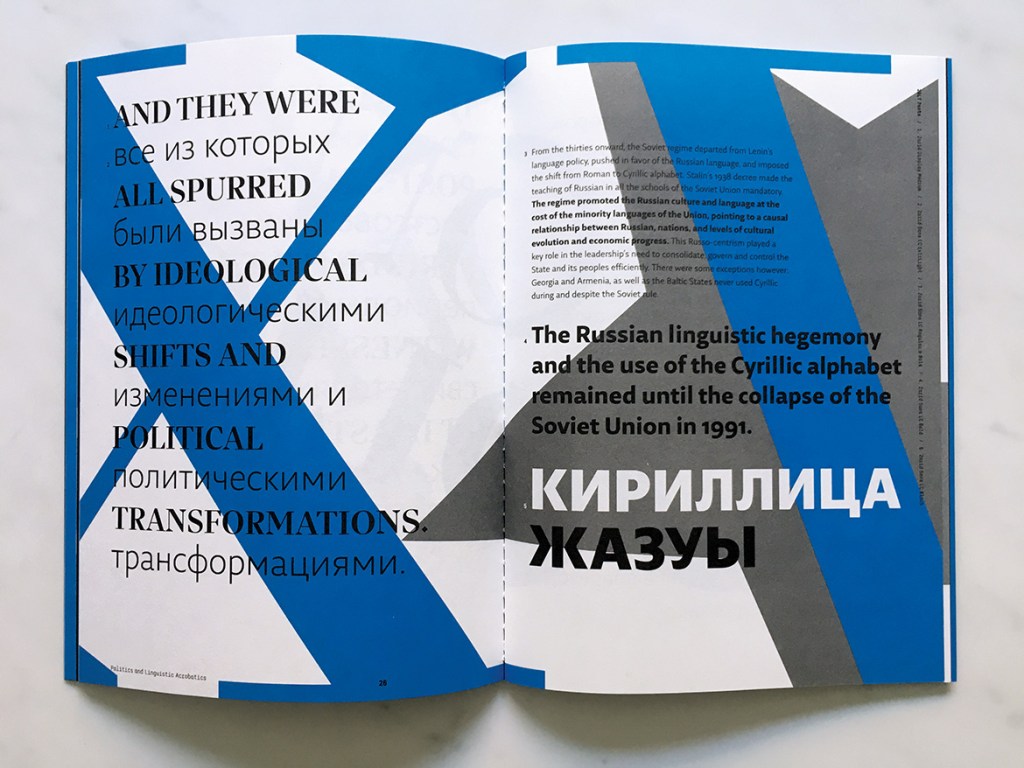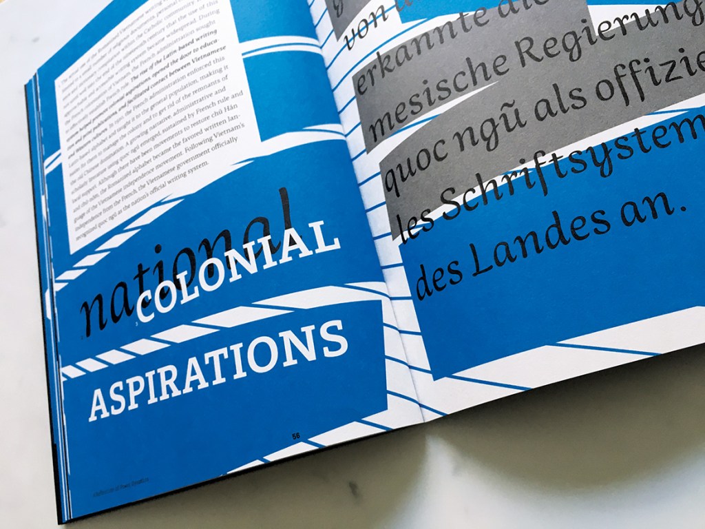 From the Aljamiado topic, other scripts’ stories were found and researched. The interest was in languages that adopted and changed to different scripts based on historical, cultural, and/or political influences. From the collected research, it is important to understand that our identities are intertwined with different backgrounds, cultures, and languages. We are recognized by our past, our roots, and our mother language. From a diverse list of languages researched, three topics were selected for the publication: the Turkish language, the Post-Soviet languages, and the Vietnamese language. The publication contains four chapters, each written in two or three languages in connection with the topic. The use of several languages and scripts echoes the drive of 29LT to support several world scripts. Every chapter showcases the interlaced visual approach of two or more scripts that coexist visually to trigger historical ties.