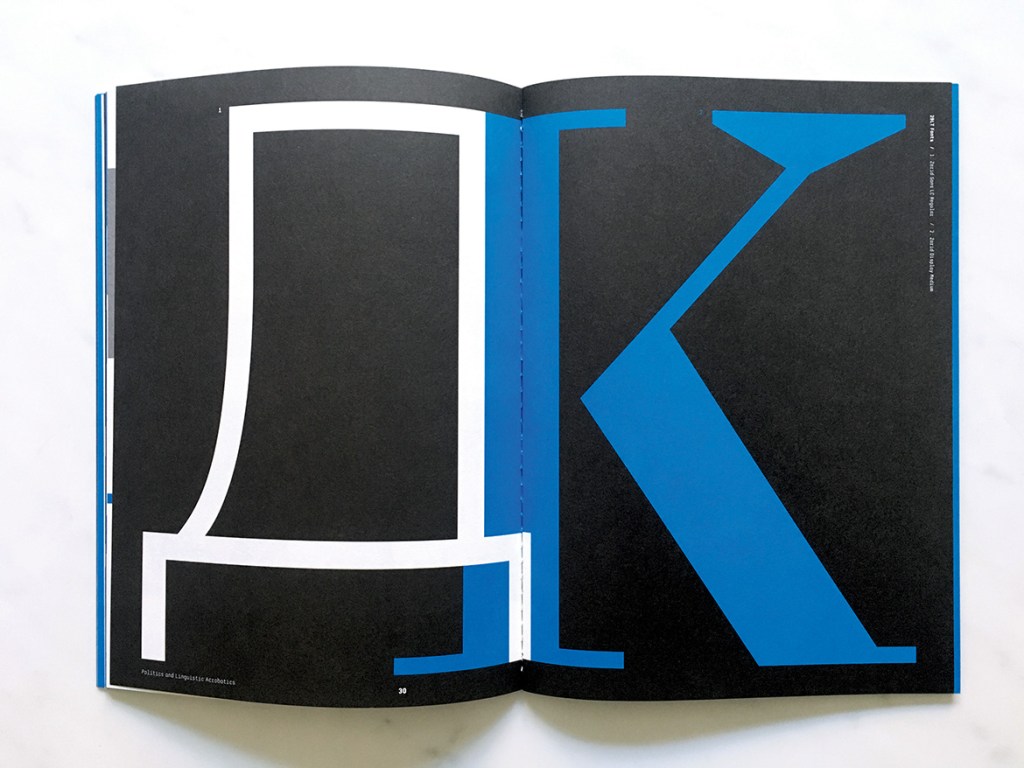 Since each 29LT typeface has its own comprehensive type specimen downloadable from the website, the printed publications do not show the technical details of the fonts, but simply showcase them in experimental typographic layouts.
