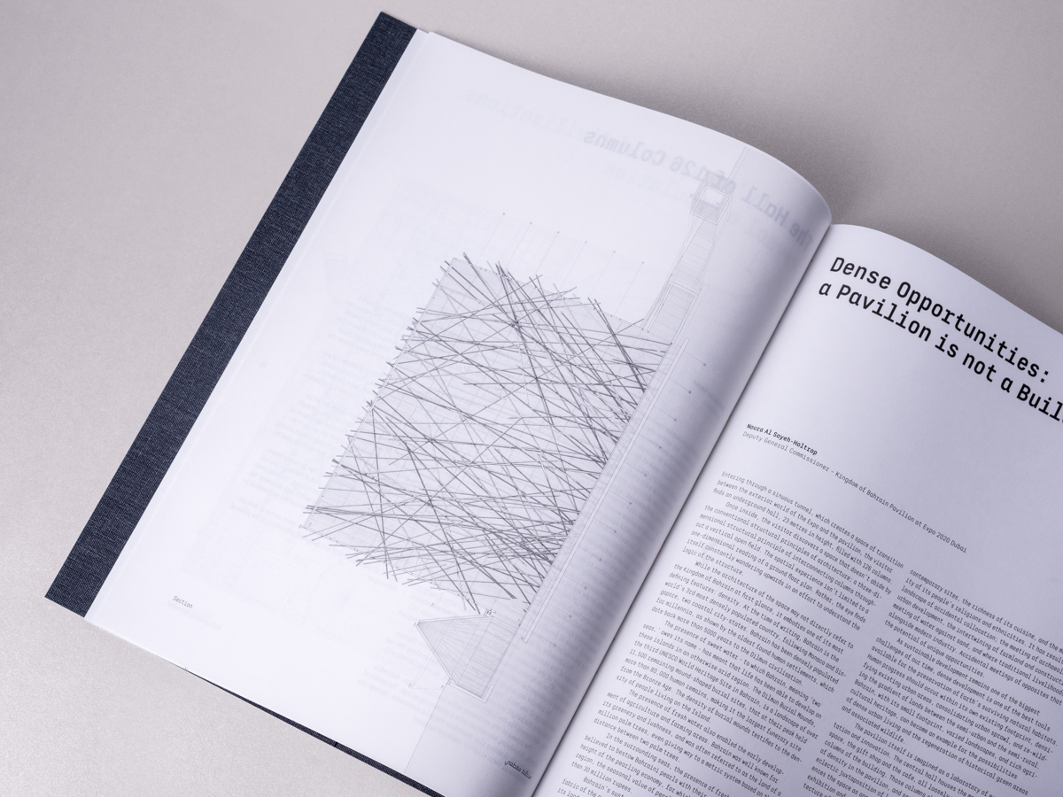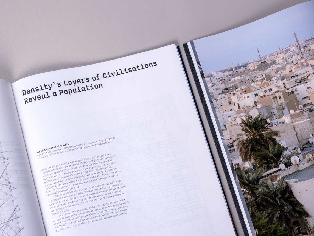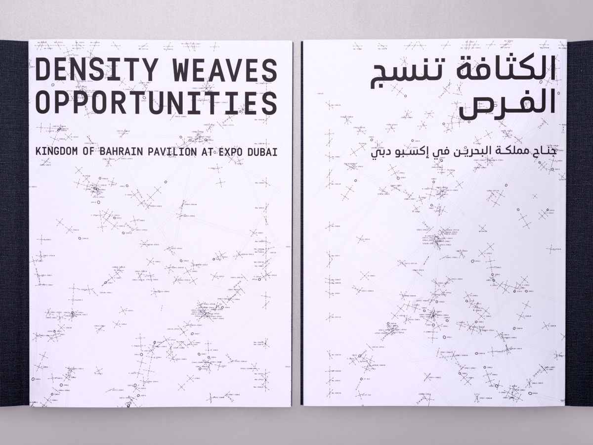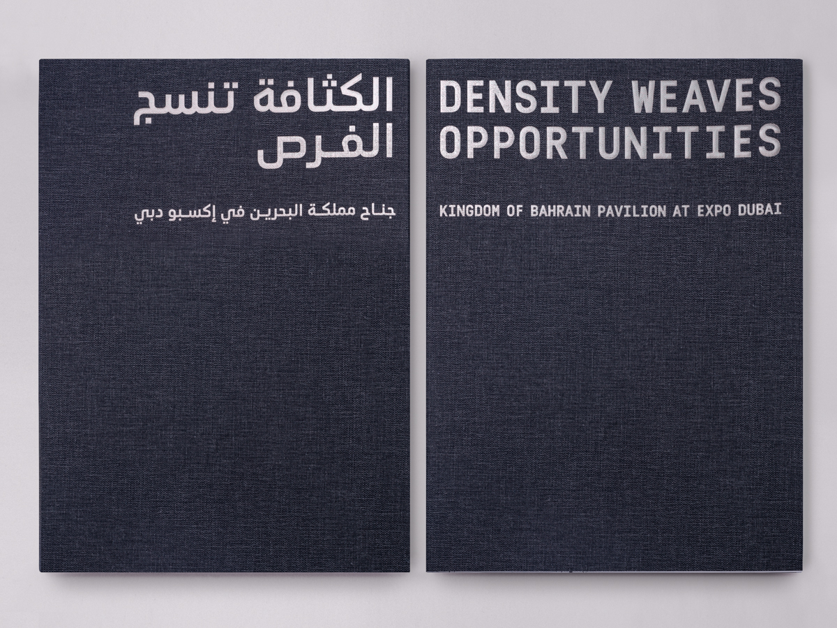 Under the title “Density Weaves Opportunities,” a special bilingual edition (1,000 copies) was carefully edited, designed, and produced for Expo Dubai. The book featured photographs of the pavilion and landscapes of Bahrain taken by Maxime Delvaux including essays by the Kingdom of Bahrain Pavilion commissioners and architect Christian Kerez in Arabic and English.