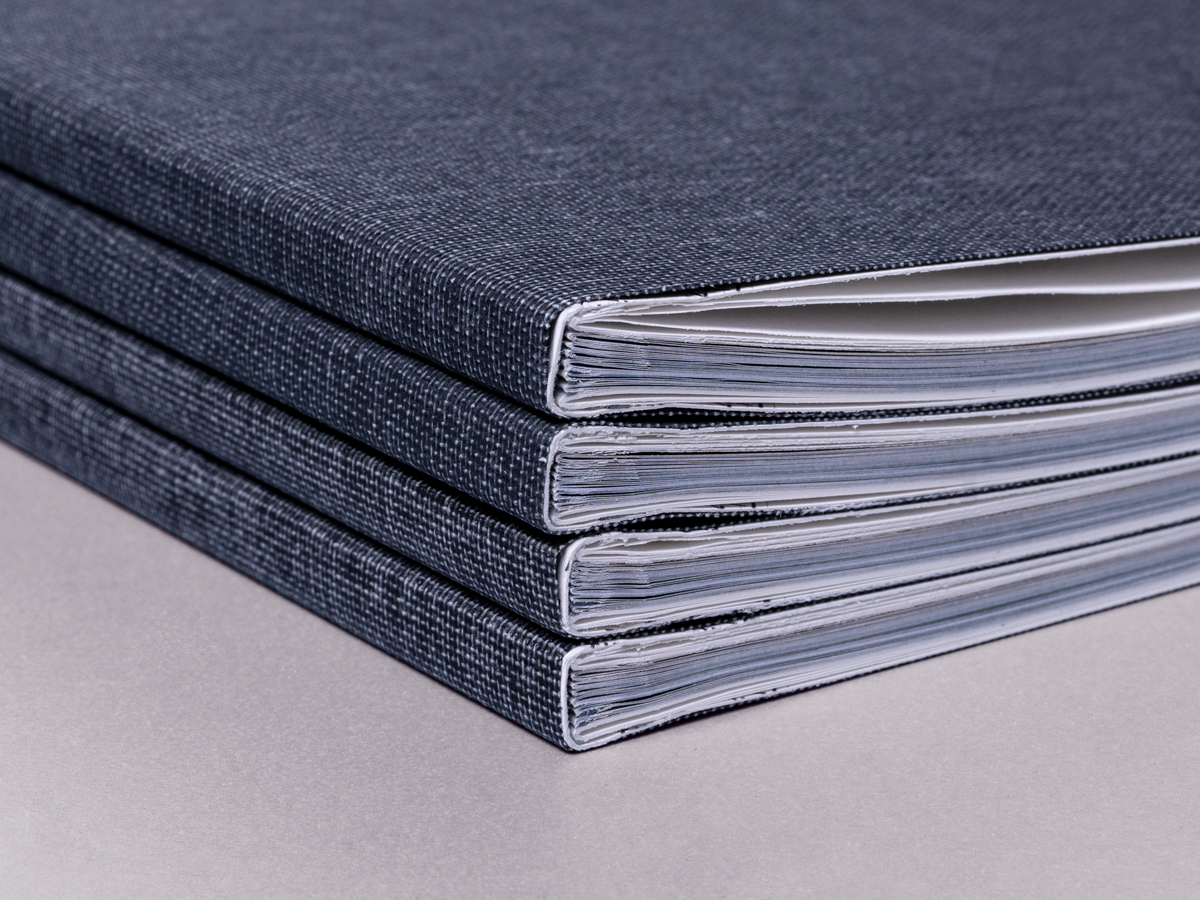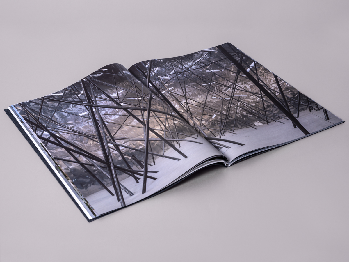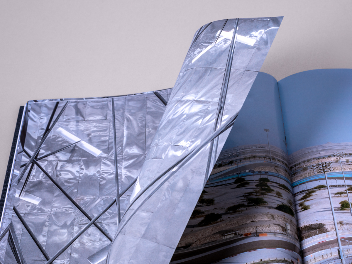The mirrored design had two covers with metallic foiled typography on linen, text pages on both sides and a prominent photography section in the middle. A sober and sophisticated selection of materials, including a dark grey linen dust jacket and a high-quality combination of uncoated and coated papers for the photography and text pages: thus the book aimed to resemble the style and themes of the pavilion. In spite of its large size, the book opened perfectly flat, allowing the view of full bleeding images and an ease of unfolding the numerous triptych pages, thanks to lightweight materials and the binding technique.
