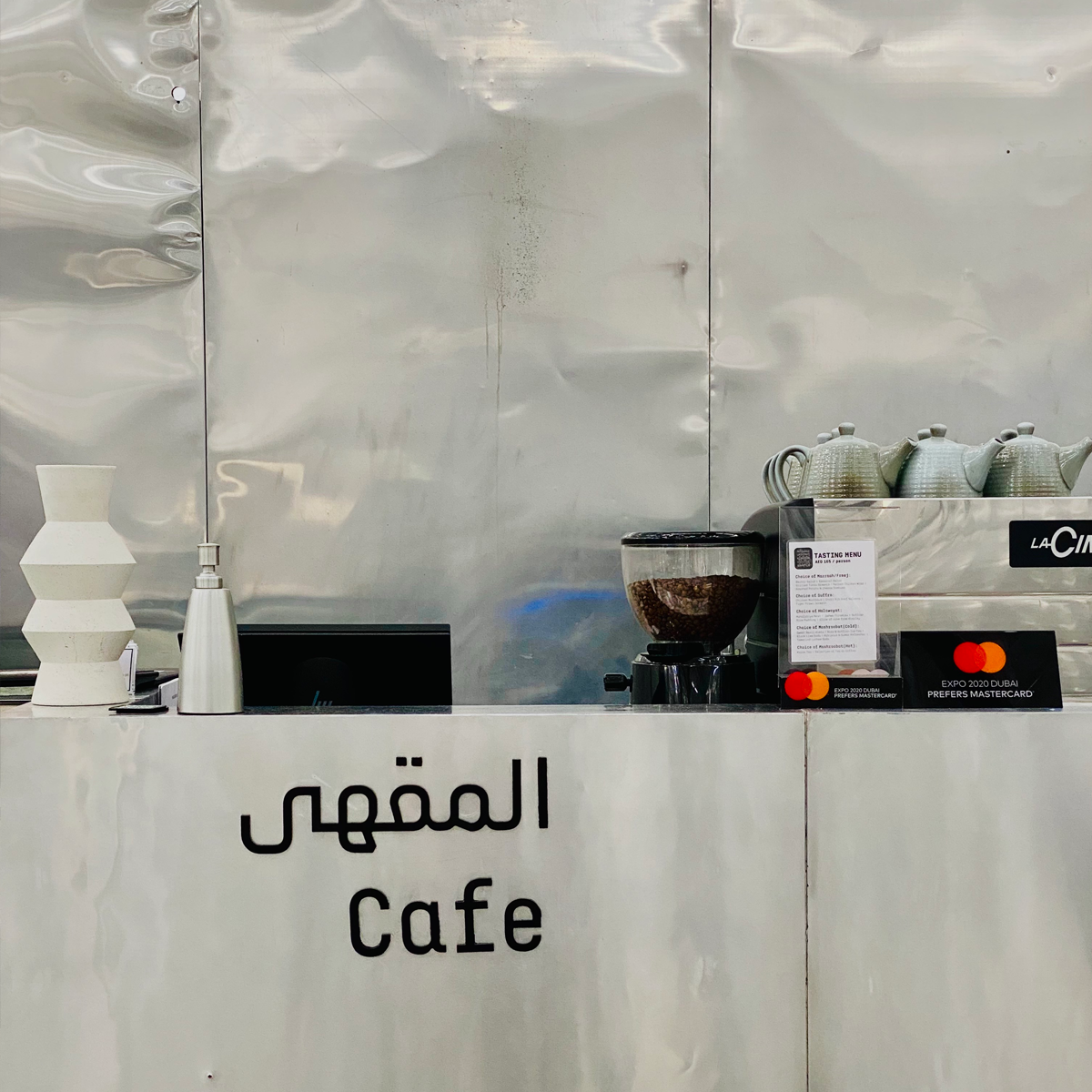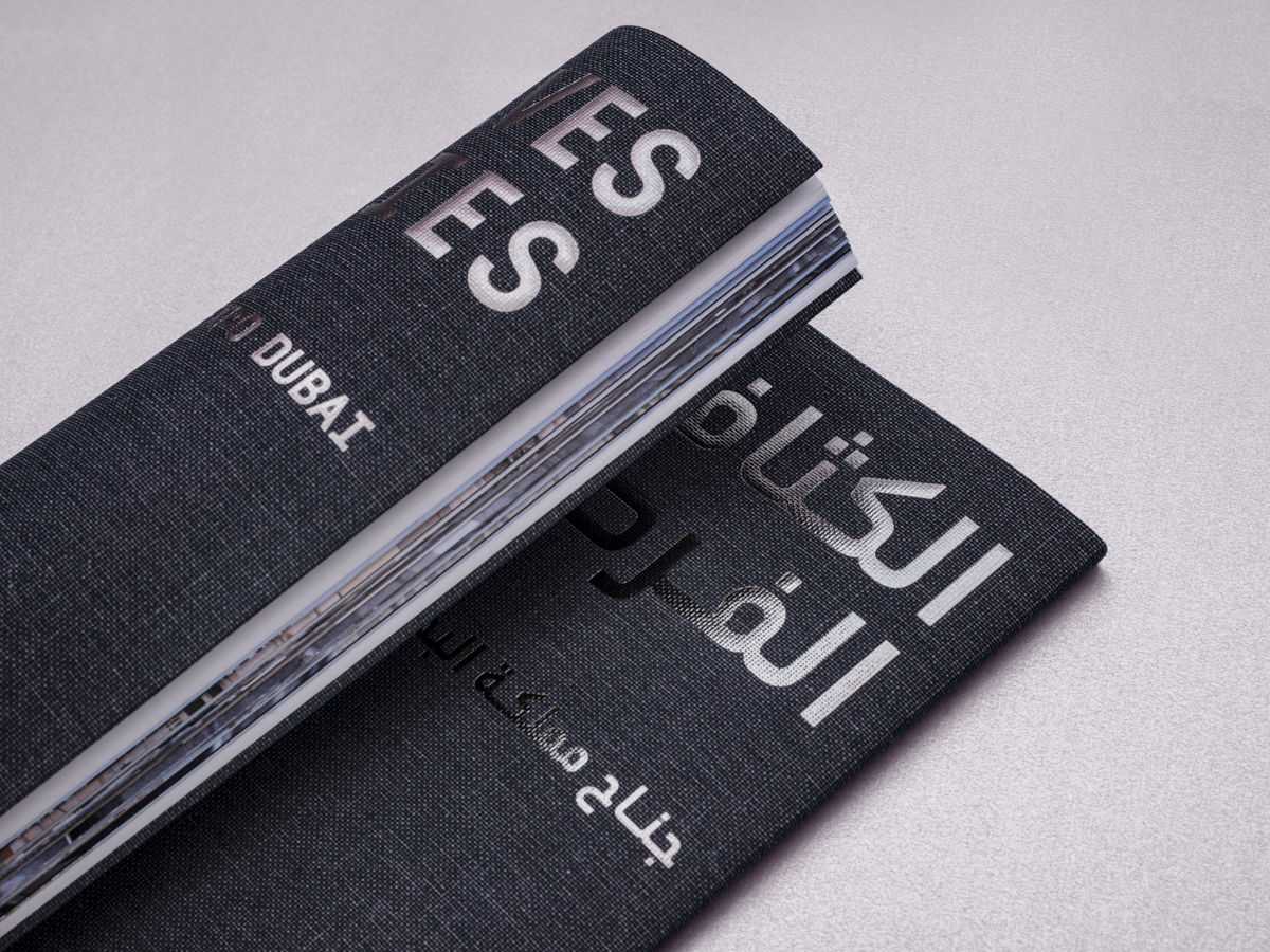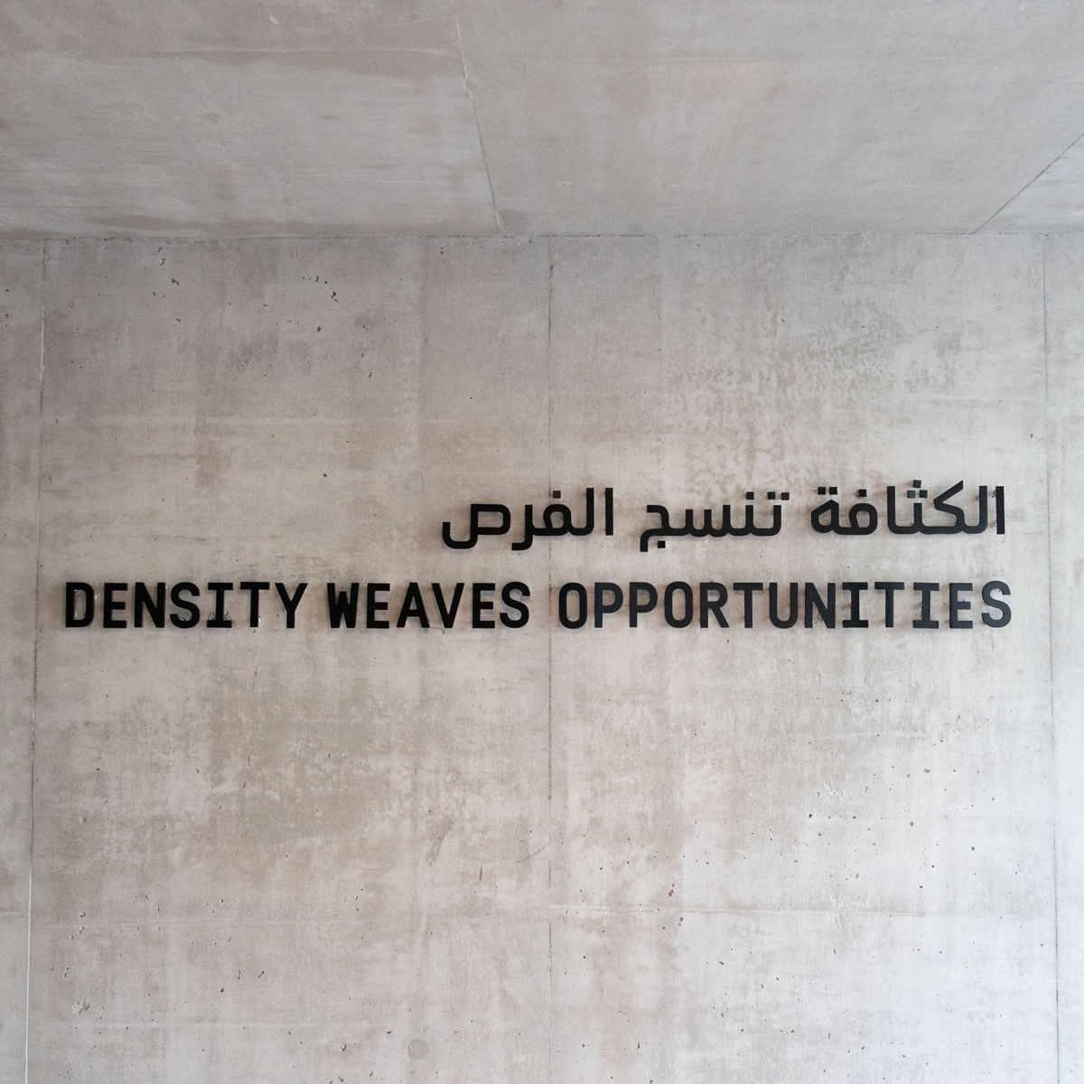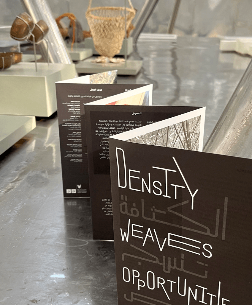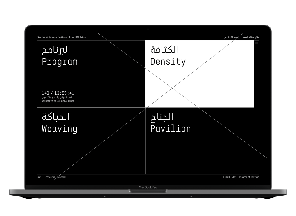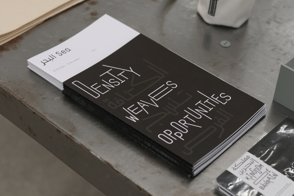 The identity was based on a set of design principles/aspects for the overall identity: Flexible, Multidirectional, and Minimalistic. The main design element was typography, all in black and white, with no colours and no added graphics, to represent density typographically. The visual result of playing with type and elongating letterforms, both in Arabic and English words, resembled the steel tubes crossing the pavilion space, as well as representing a dense environment.