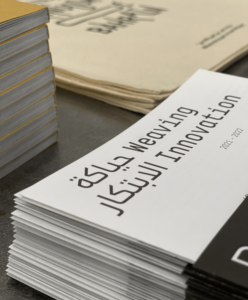 The logo on the pavilion facade was kept simple and clean, in two lines, while making it more playful for the print and web design applications. The logo became a dynamic design element that was used differently throughout the project. The logo could be rectangular, square, vertical, or horizontal, with the Arabic and English letters intertwining elegantly.