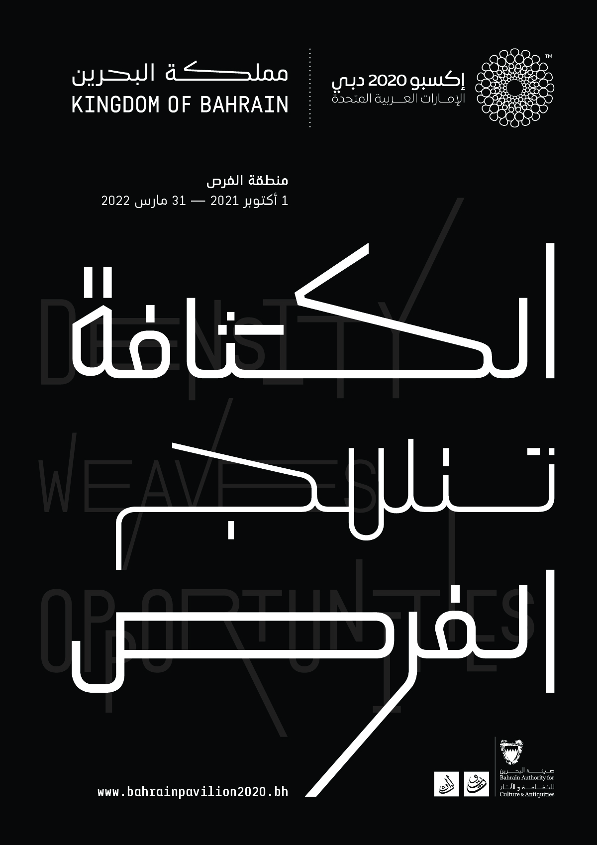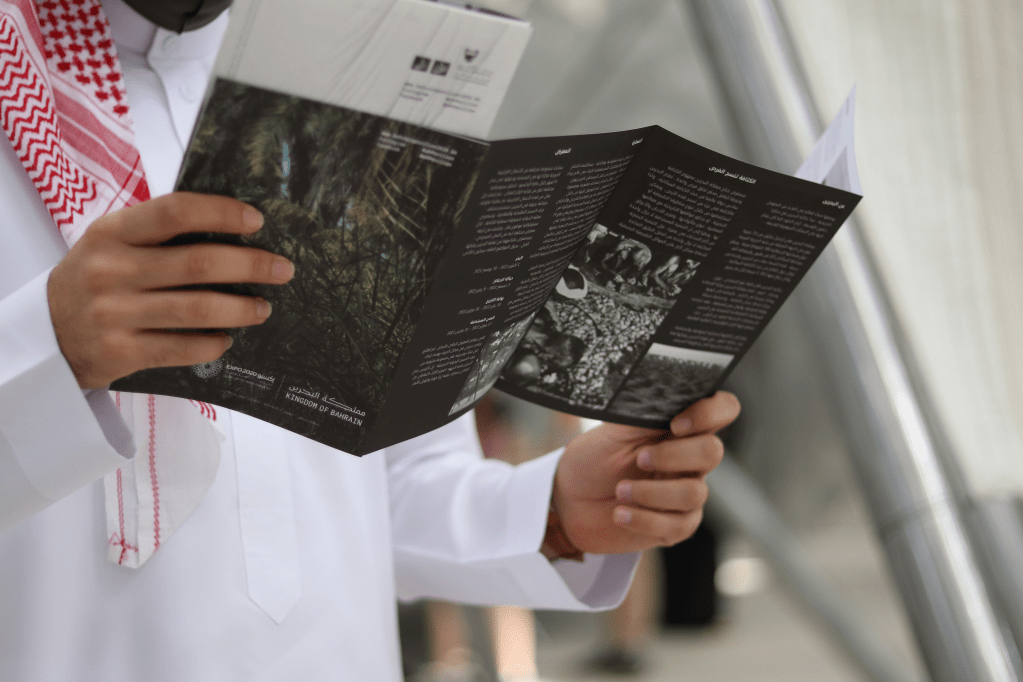 The visual identity of the pavilion resembled the theme and architectural approach of the pavilion. The design philosophy focused on creating a very dynamic and variable design solution, suitable for the wide range of applications across signage, digital, and print mediums while retaining a memorable, clear, and unique personality for the Bahrain Pavilion.