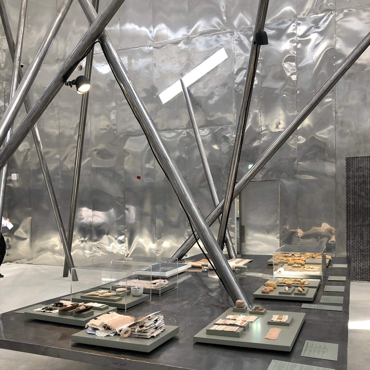 All signage and exhibition graphics shared a common typographic approach and materiality. Stainless steel wall panels, labels, and 3D metallic powder-coated pictograms were applied directly onto the concrete and stainless steel surfaces of the building to keep a seamless and minimalistic appearance. A set of simplified pictograms was specially created to complement the typographic signs. The large stainless steel pavilion logo with the name of the pavilion was located at ground level by the main pavilion entrance.