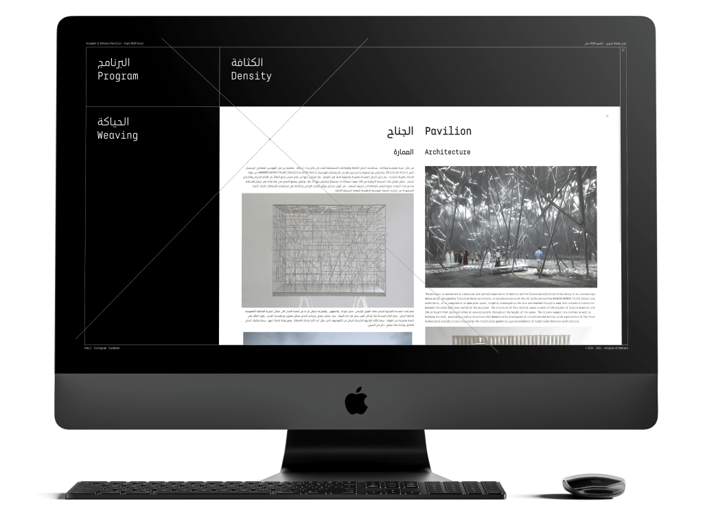 Following the same concept, the website design revolved around limited space and density. Instead of having a separate webpage for each section of the website, it was decided to place all the content into one webpage. The different sections of the site compress or expand to allow space for the selected content to show. The website is a simplified representation of the pavilion, the content is limited within the screen dimensions, and the space is used smartly to accommodate all the information. Furthermore, the mouse cursor is replaced by two intersecting lines, mimicking the steel beams in the pavilion.