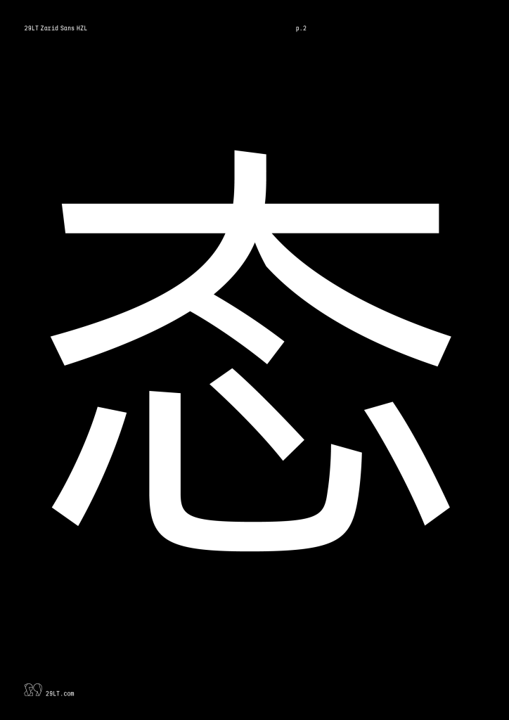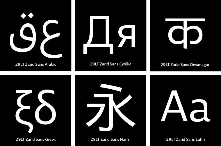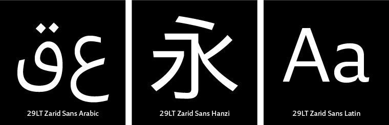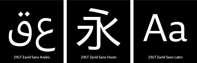 29LT Zarid Sans Hanzi is a member of the Zarid Sans multi-script superfamily, which currently also supports Arabic, Latin, Greek, Cyrillic, and Devanagari scripts.