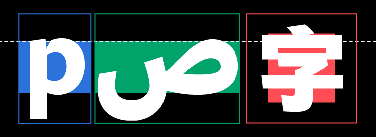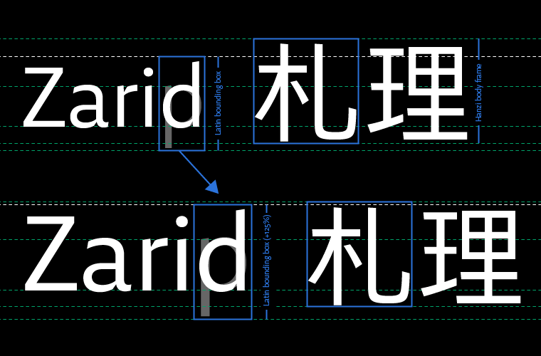 While Latin has a baseline, ascender, descender, and body height, and Arabic typography has about the same typographic guidelines logic although different naming, adapting the proportions for these two scripts was visual. But Hanzi are all set in a squared frame that has to sit in between the ascenders and descenders of these two scripts, to seem coherent sizes.