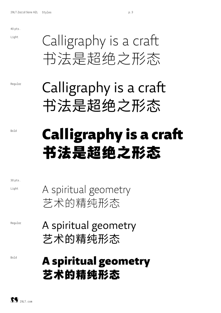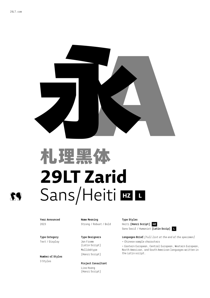 As for the word “Sans,” the related word for Chinese sans serif-style typefaces is 黑体 or Heiti, which we kept for the Chinese version to be more familiar and relevant to Chinese users. The Chinese name of 29LT Zarid Sans is therefore “29LT 札理黑体.” But to be also legible to non-Chinese users, we chose the name “29LT Zarid Sans Hanzi,” with Hanzi being the name of the Chinese script.