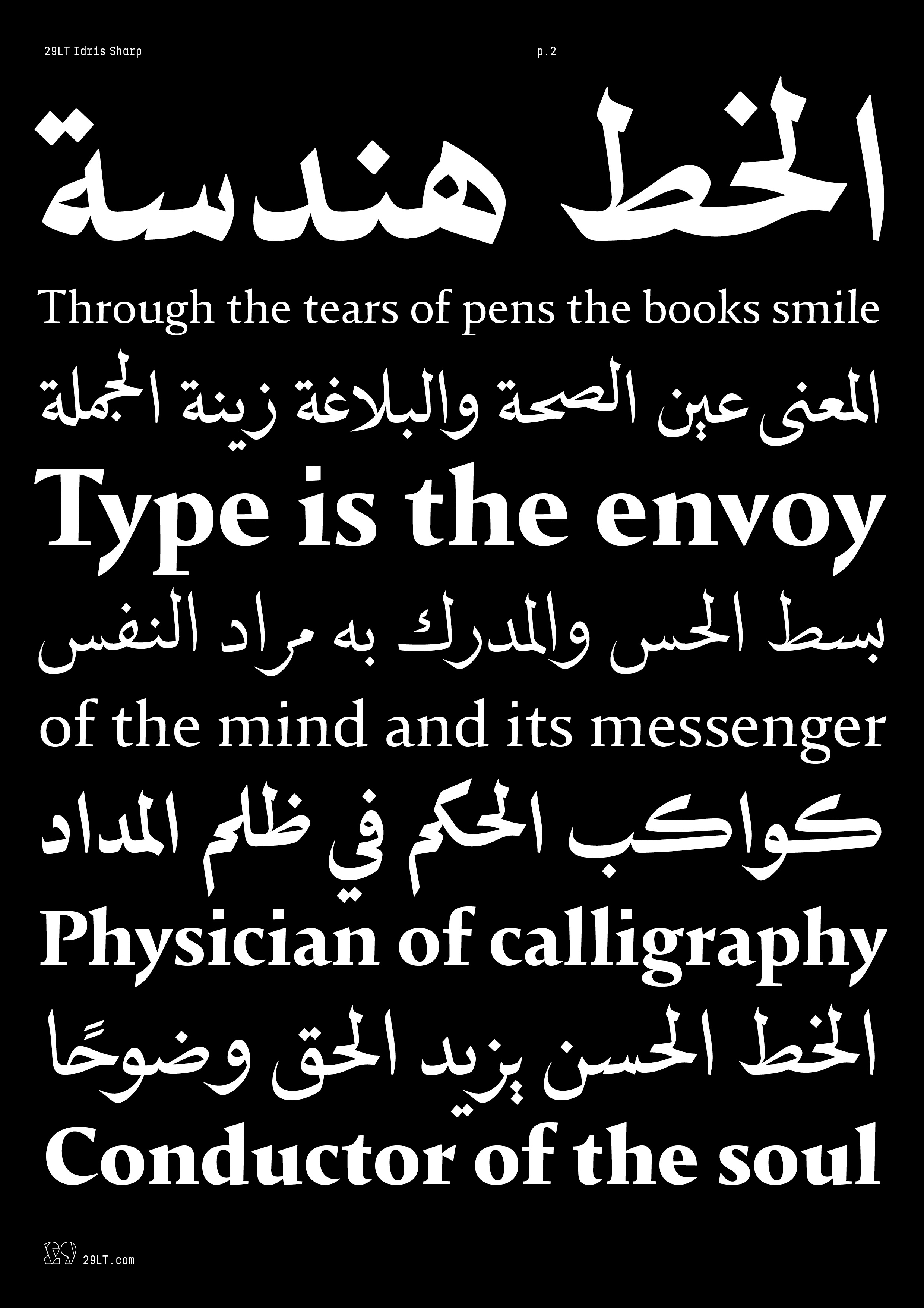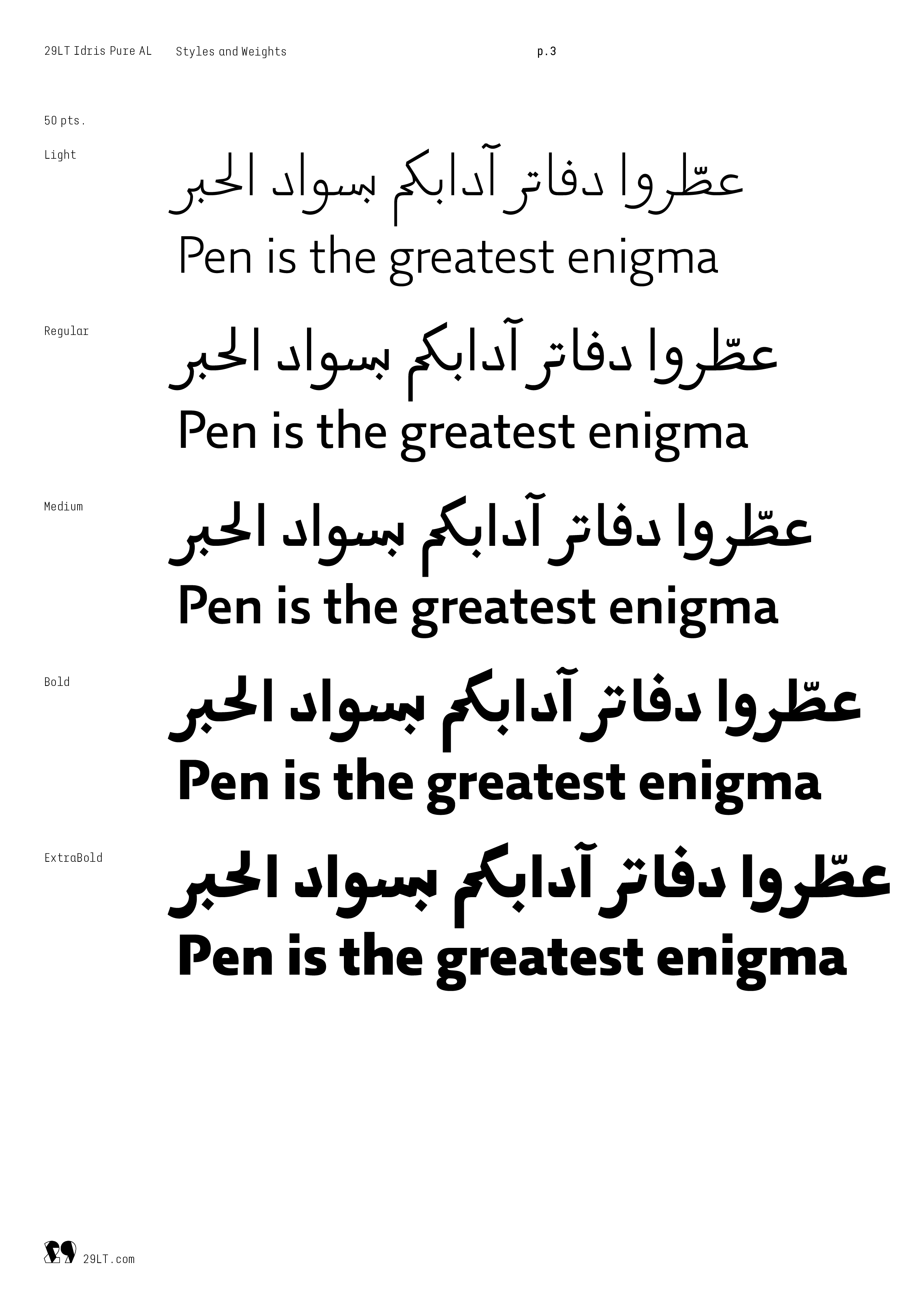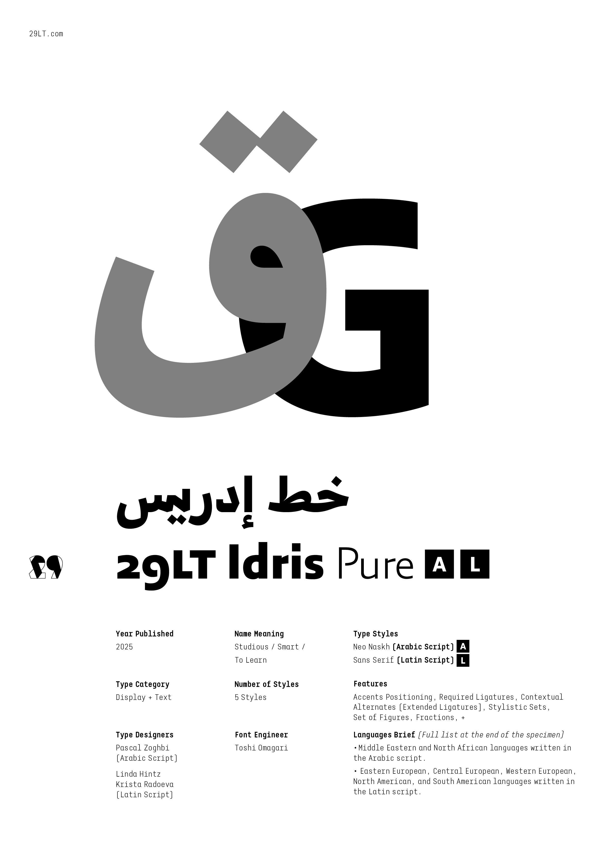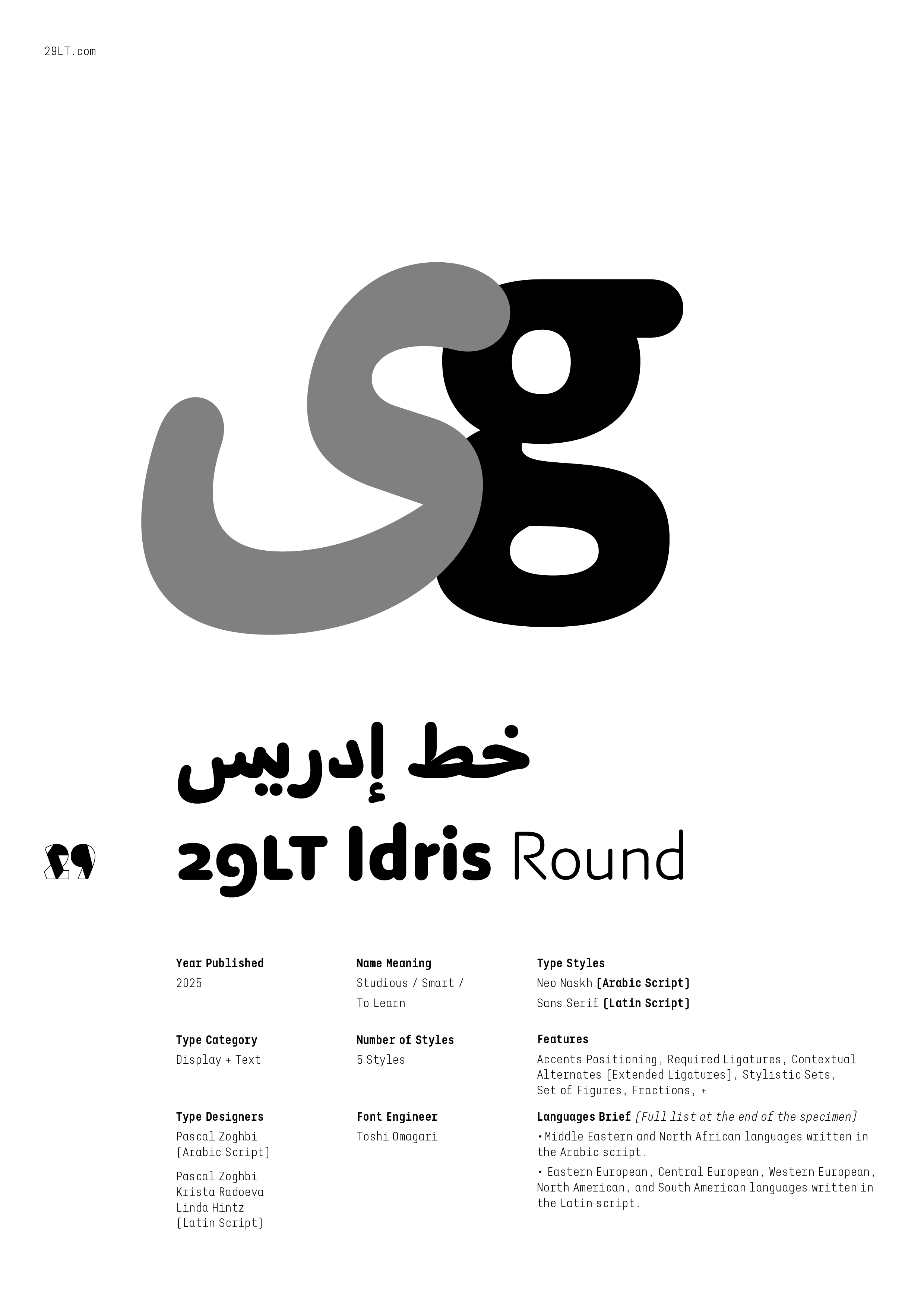 29LT Idris Pure and Round are a continuation of the Idris Sharp and Flat type family, introducing two new typographic voices to the contemporary Naskh type system. The type set expanded from ten to twenty styles, with five styles in each typeface, resulting in a more diverse and versatile visual communication tool. While all four versions are suitable for display or copy text, the Sharp version is recommended for display text, the Flat and Pure versions for copy text, and the Round version for casual text. Generally, the Sharp and Flat styles are associated with formal text, while the Pure and Round styles can represent modern and informal text.