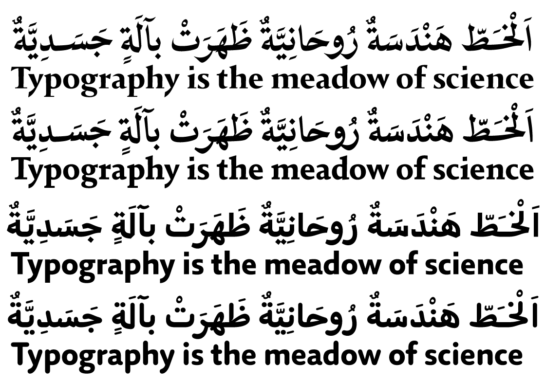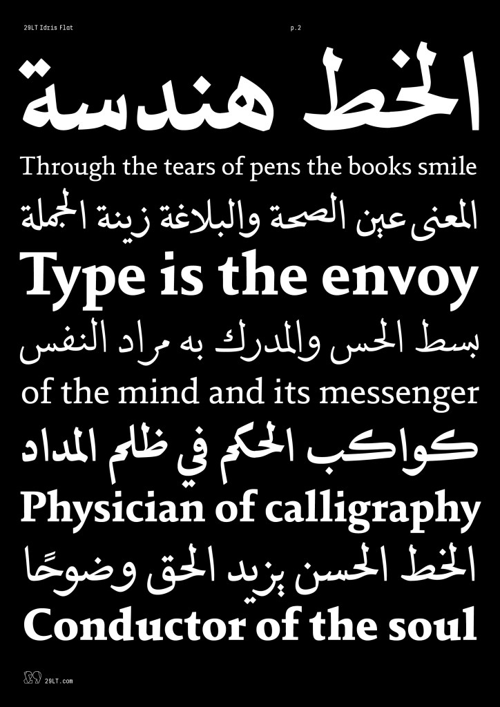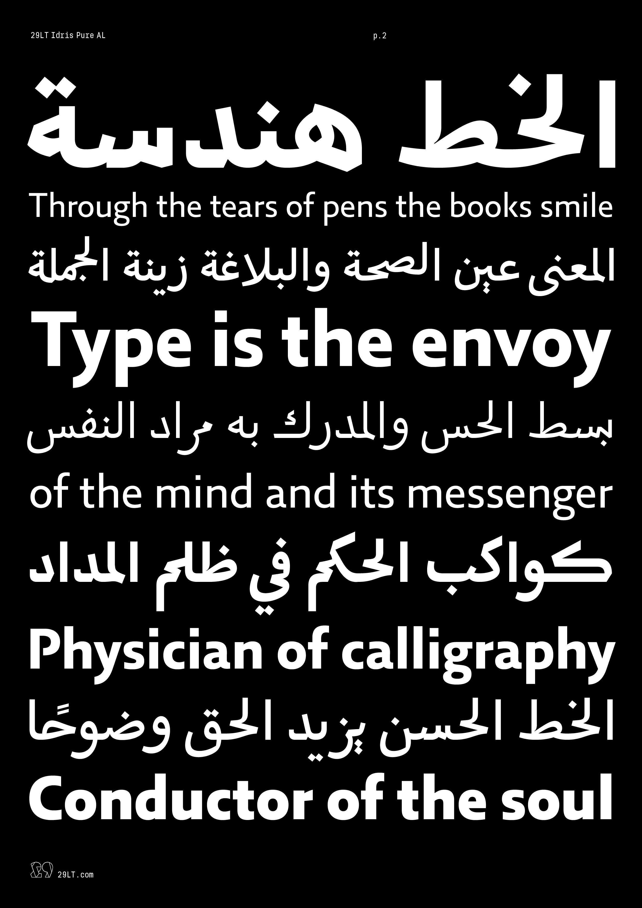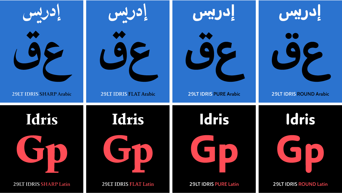 The inclusion of the Pure and Round styles makes the Idris type family one of the most extensive Neo Naskh type systems created to date. Beyond exploring the boundaries of design concepts applied to the Naskh calligraphic system, these fonts integrate the latest type design technology within the OpenType framework. This makes them a versatile design tool for Arabic typographers, enhancing the typographic quality of their contemporary projects.
