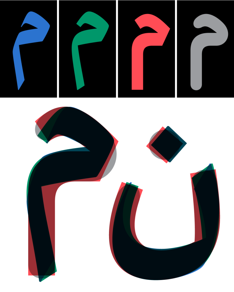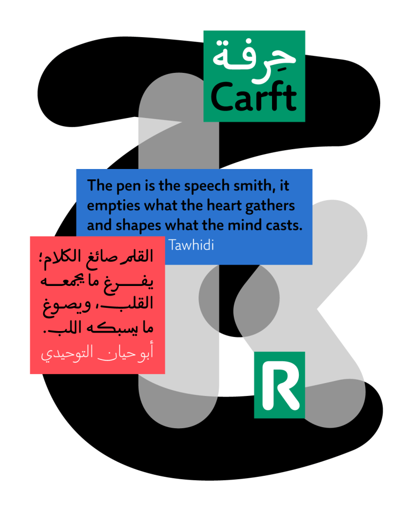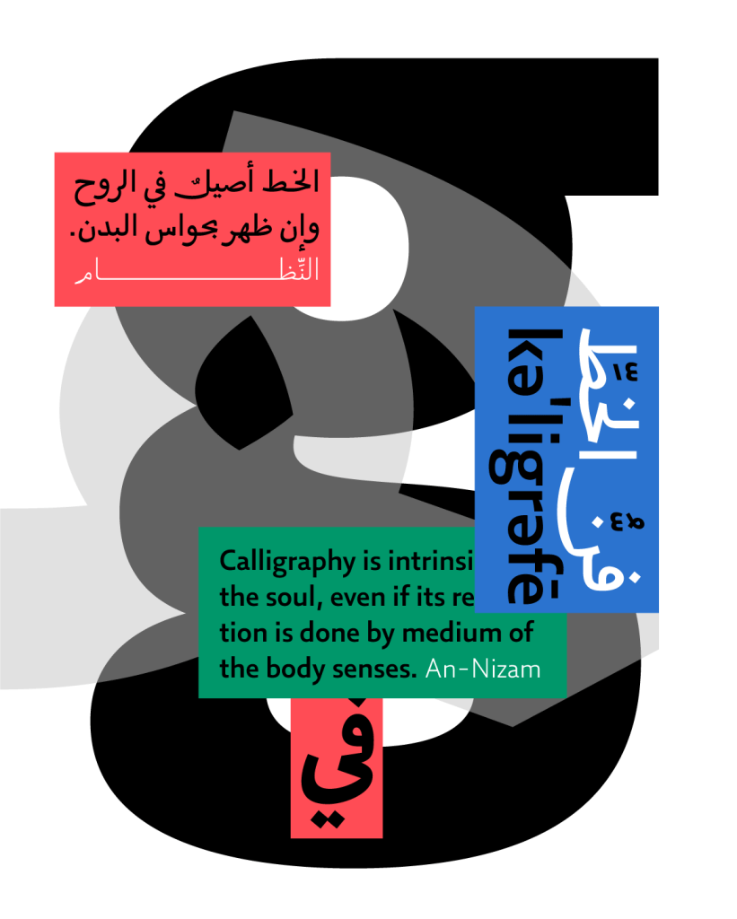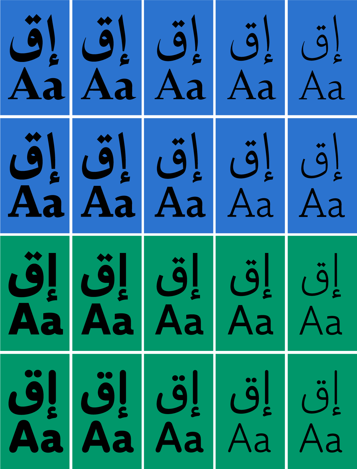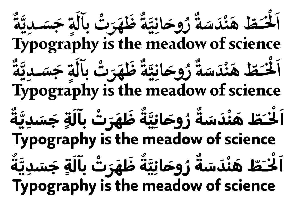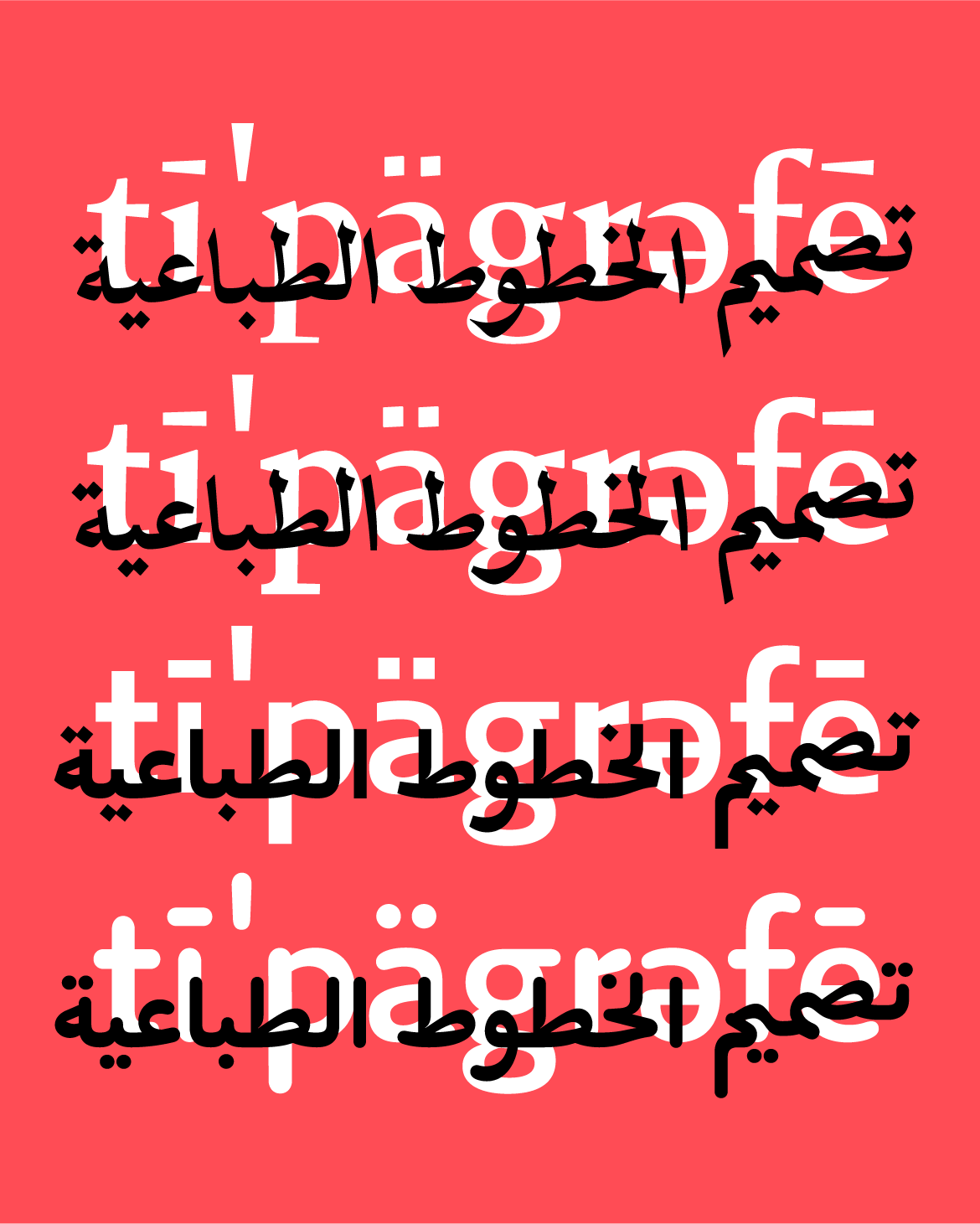 In the Arabic set, the purpose of creating these two additional versions is to explore the extent to which the boundary between calligraphy and simplified typography can be pushed without compromising the composition of the Naskh typographic structure. Specifically, the challenge is to create a Neo Naskh typeface that maintains the concept of horizontal and cascading configurations while avoiding becoming a simplified Mastari Naskh. In contrast, in the Latin set, the Pure becomes the humanist sans of the Flat serif set, while the Round gives the Pure a round and friendly appearance.