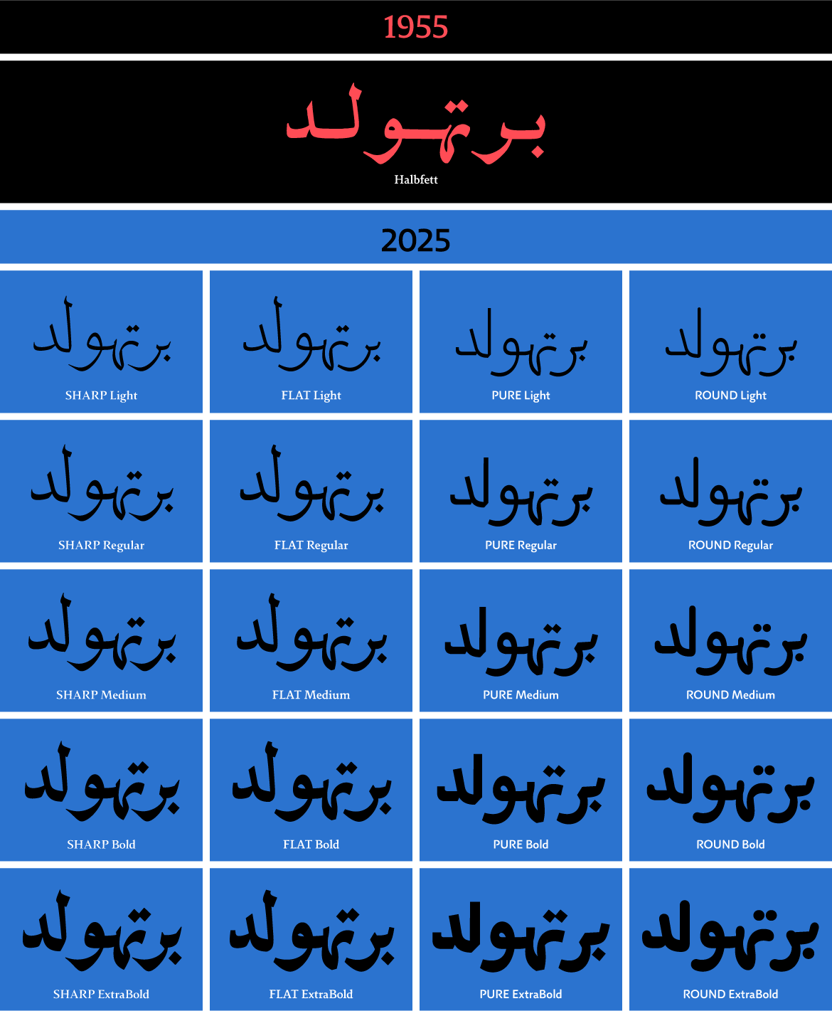 This type system originated from an extensive search and discovery of the Berthold Arabisch Halbfett Nr. 49 typeface, created in the 1950s. For more details about the revival of this typeface and the development of the 29LT Idris Naskh type system, refer to the previous article on this topic. Additionally, you can watch Pascal Zoghbi’s talk at Typographics 2023 at Cooper Union, New York, USA, where he shares an intriguing account of the research findings and process.