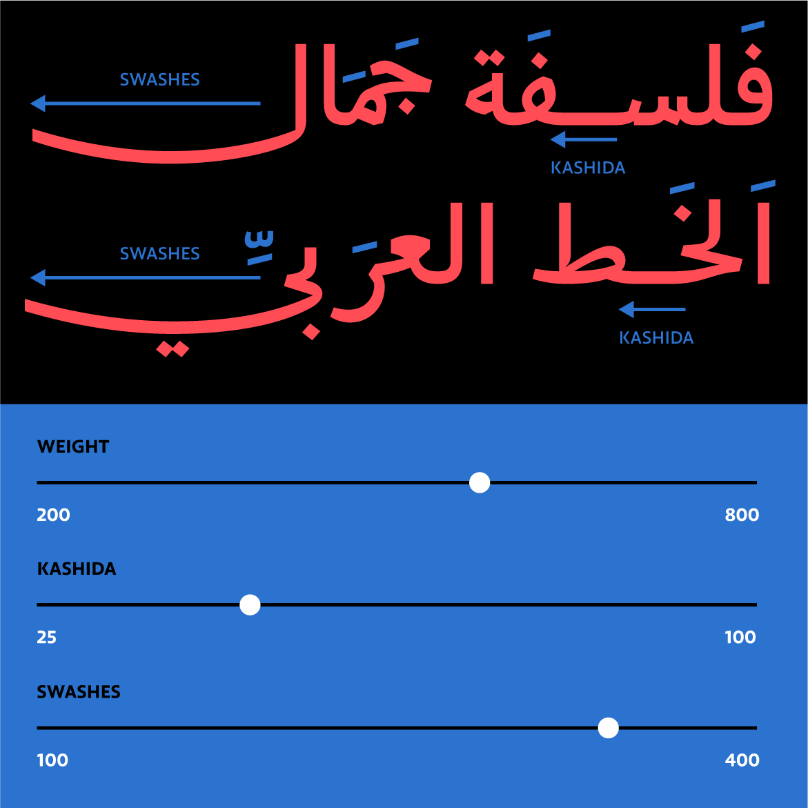 In the variable font version of the Idris type system, while the default Weight axis remains consistent across all four styles, the Pure and Round styles eliminate the Contrast axis, and the Extension axis is expanded into two separate axes: Swash and Kashida. This division of the Extension axis provides the type setter with greater control over a certain Arabic text extension, particularly during text justification.