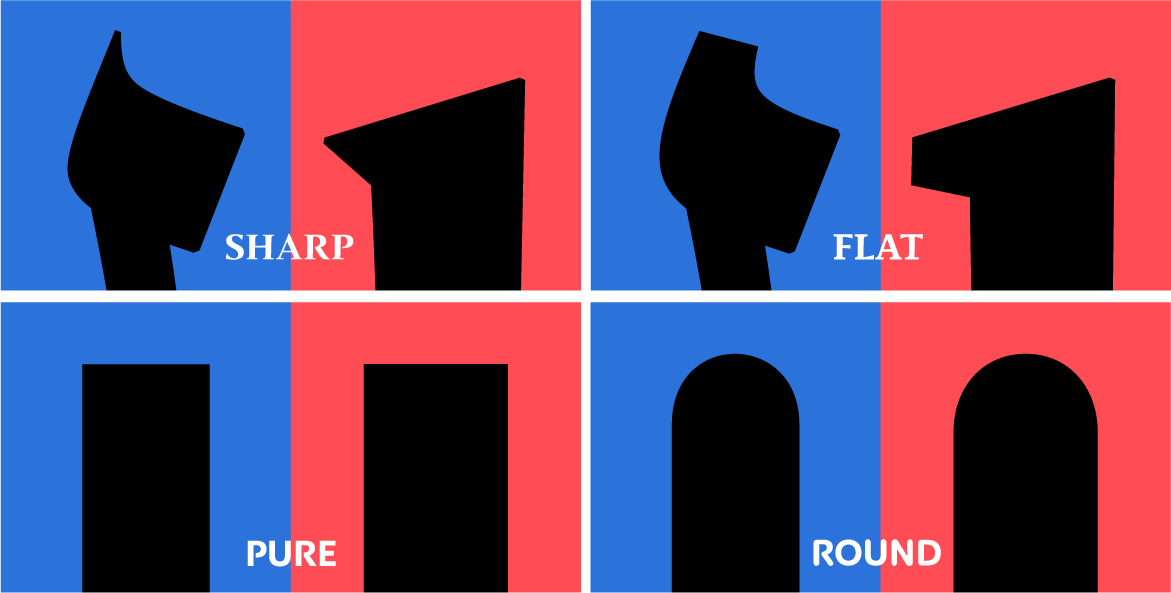 Finally, naming the styles as Sharp, Flat, Pure, and Round instead of opting for the conventional Western typographic categorization (Serif, Sans, Slab, etc.) is an attempt to establish new typographic terms that are suitable for global scripts and extend beyond the Latin script system. This approach prioritizes the creation of new terms over the Western categorization and aims to define more neutral terms that can apply to any script, irrespective of its specific typographic characteristics.