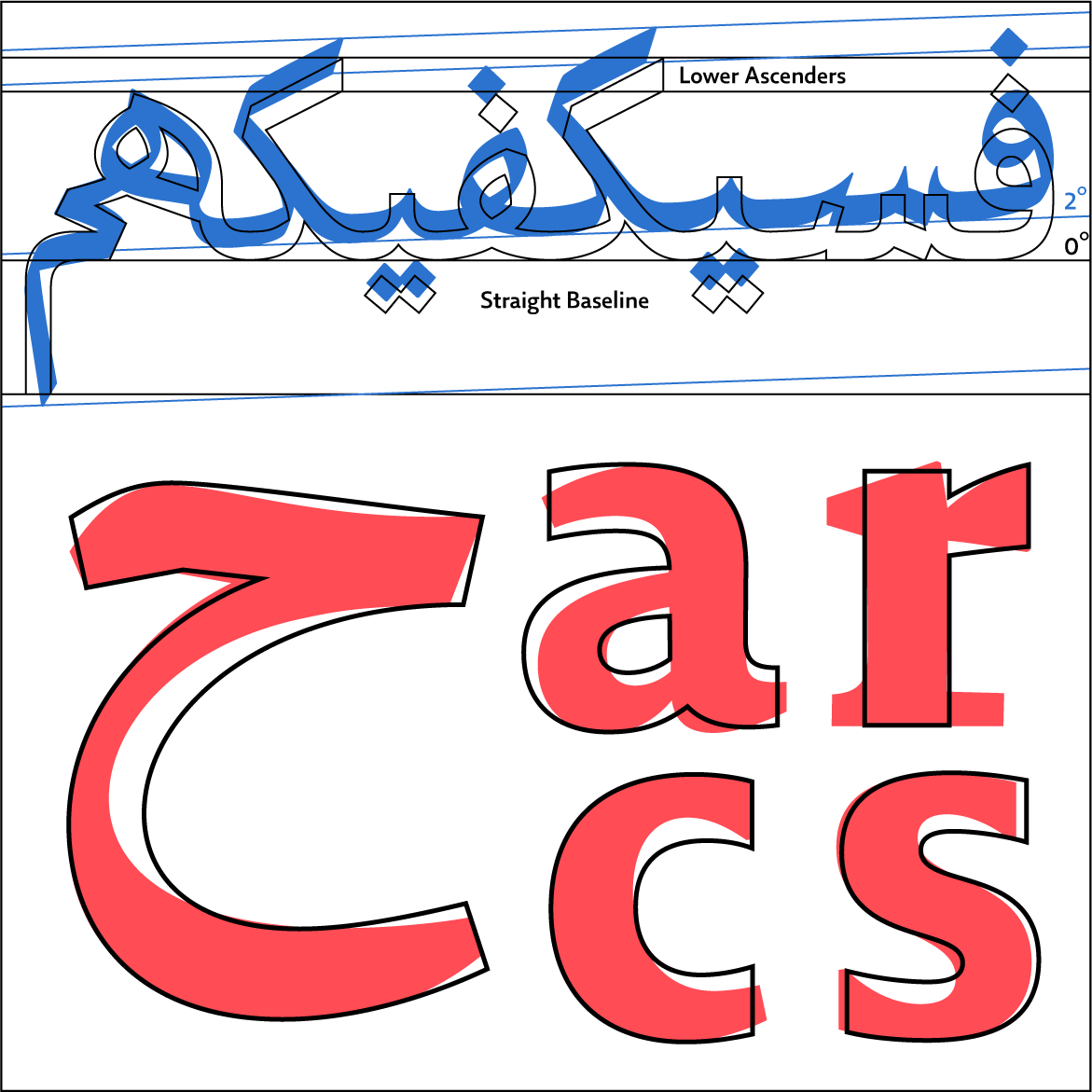 In the Arabic set, ascenders were lowered, and accents were repositioned closer to base forms, contributing to a shorter overall vertical height. Achieving ideal vertical height balance between Arabic and other scripts is challenging due to Arabic’s higher ascenders and lower descenders. Vocalized Arabic text requires looser leading, affecting Latin text’s vertical measurements. A typesetter using bi-script fonts must set appropriate leading for each script to ensure consistent text texture or color. By default, in bi-script Arabic and Latin typefaces, vertical matrices are based on Arabic heights, potentially leading to loose Latin script leading. Tighter leading might be needed for Latin script to match Latin fonts.