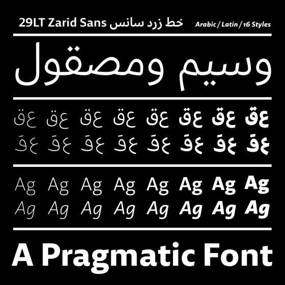 First additions are the Cyrillic and Greek scripts to 29LT Zarid Sans typeface making it cover four scripts; the Arabic, Cyrillic, Greek, and Latin scripts.
