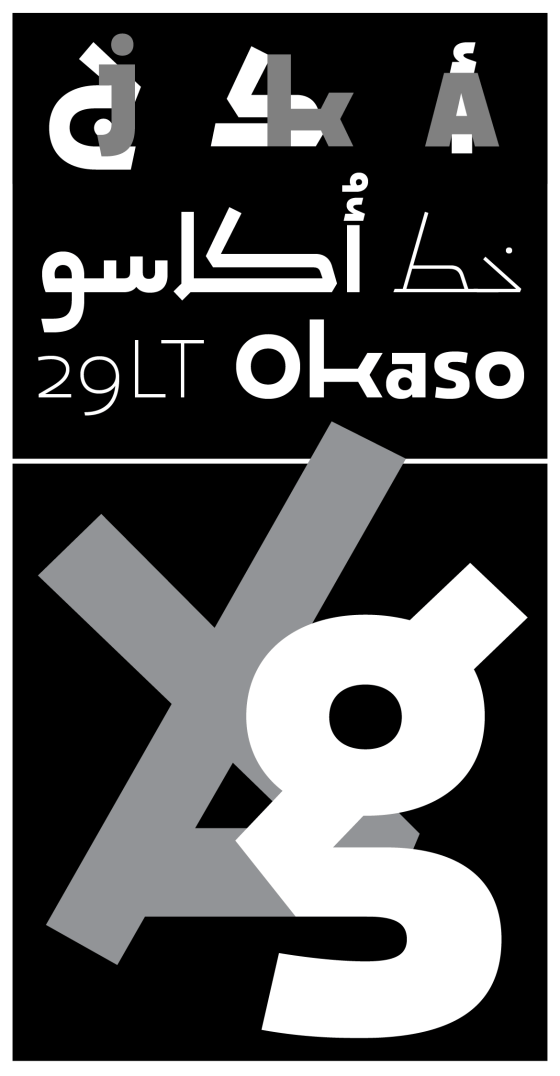 29LT Okaso stands out from standard Arabic fonts, both in aesthetics and functionality. It embodies a fascinating typographical experiment that actually works particularly well when seeking harmonious contrast between enigmatic and mystical overtones and contemporary designs.