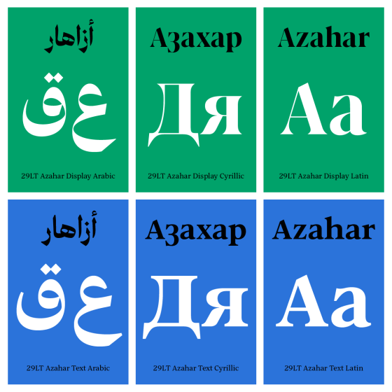 The 29LT Azahar type family includes Text and Display categories, each with five weights in both Latin and Cyrillic, and a Neo-Naskh/Neo-Thuluth hybrid Arabic style. The versatile variable font format allows extensive weight and optical size control, making it suitable for various design needs. The typeface reflects a blend of diverse cultures and a 29LT’s commitment to creating multi-script typefaces.