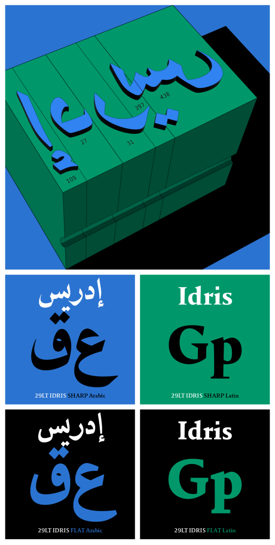 29LT Idris is a modern typeface blending Arabic Naskh with Serif Latin features, available in Sharp and Flat versions, each offering five weights. Its design, inspired by historical influences, has been enhanced using advanced technology, ensuring improved legibility for both body text and display use, with a significant focus on Arabic calligraphic standards.